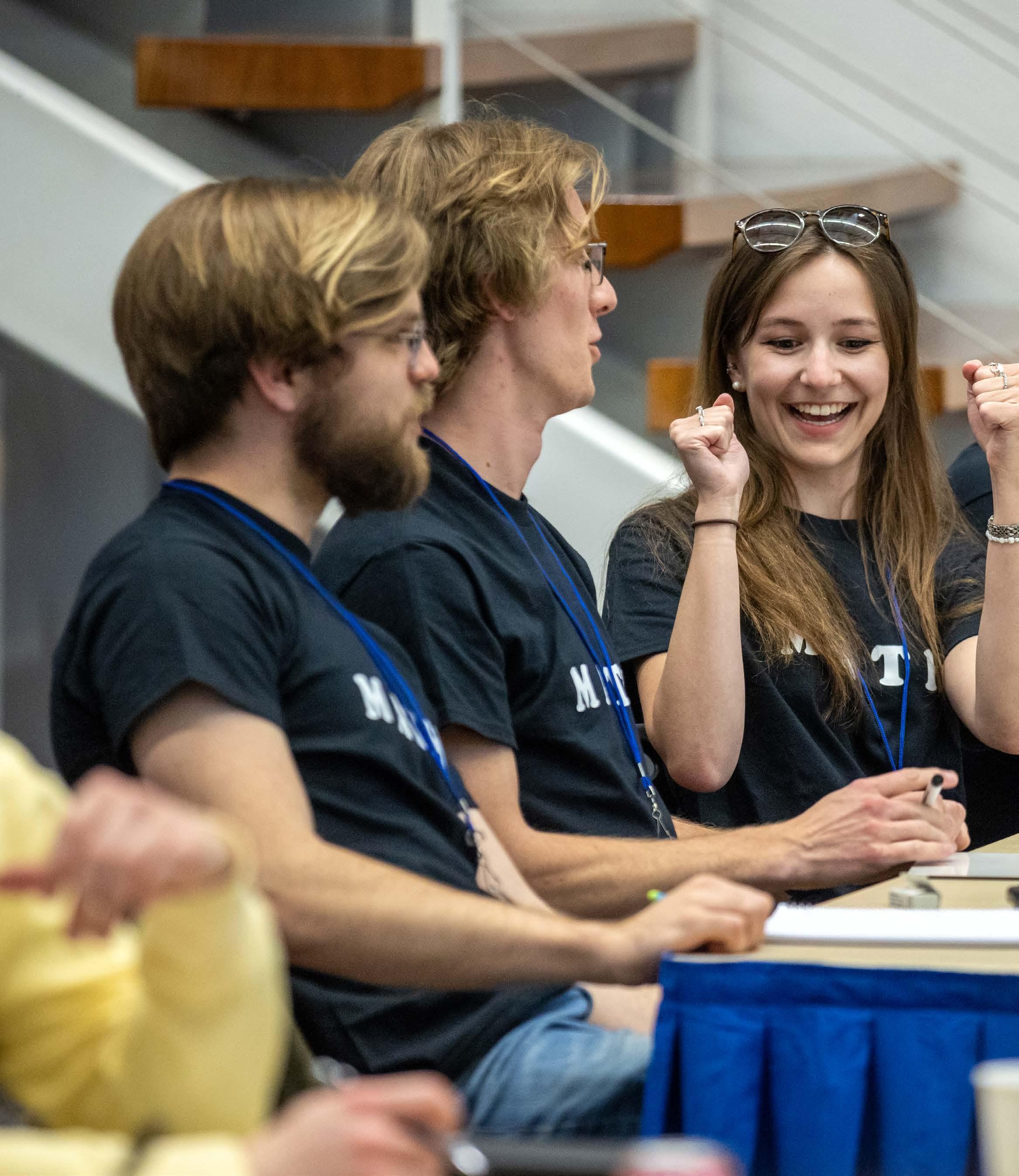 (L-R) Zachary Jensen, ’25, engineering physics; Seth Schmidt, senior, mathematics; Emma DeCoster, junior, civil engineering; and Olivia Tingo, senior, mathematics, participate in the Face Off student mathematics game show at the Mathematics Association of America –Wisconsin Section meeting held at UW-Platteville on April 4, 2025.
