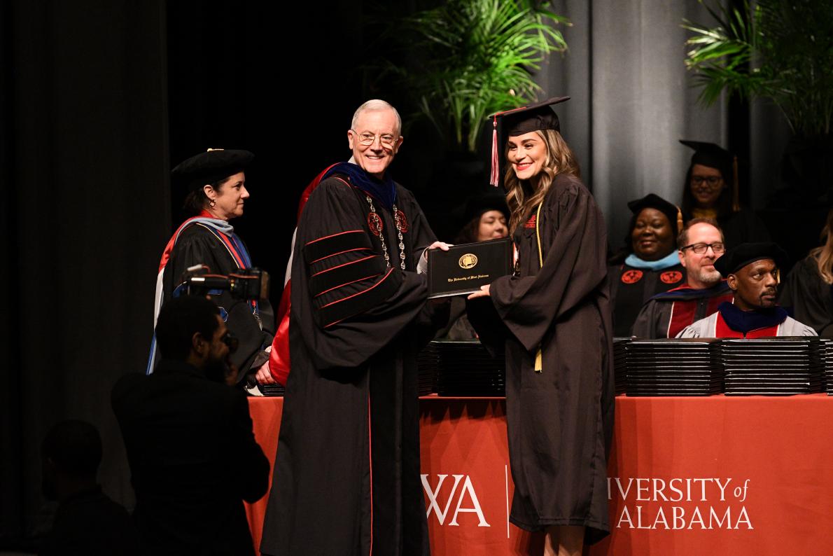 Wilson Hinson, grandson of 1902 alumnae Ruby Ward Moore, and his wife, Tee, visited campus in the fall of 2023 to return his grandmother’s Alabama Normal College diploma to her alma mater and hometown. Accepting on behalf of the University were Amanda McRae (left) and University Provost Dr. Tina N. Jones (right).