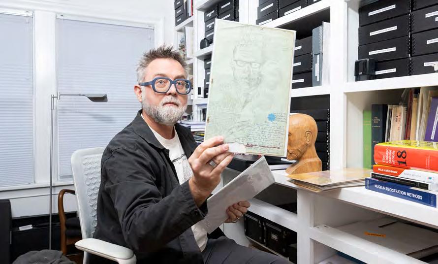 Demi Raven, ’02, tends his archive of works by Brion Gysin and William S. Burroughs. Raven and his wife, Janet Galore, ’89, have turned their residence, once a 1920s-era grocery store, into a home for collections, creations and community events.