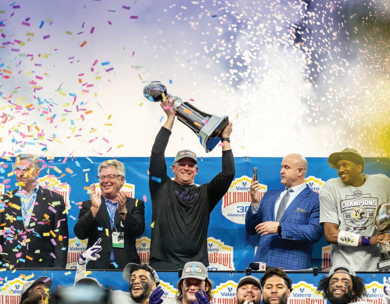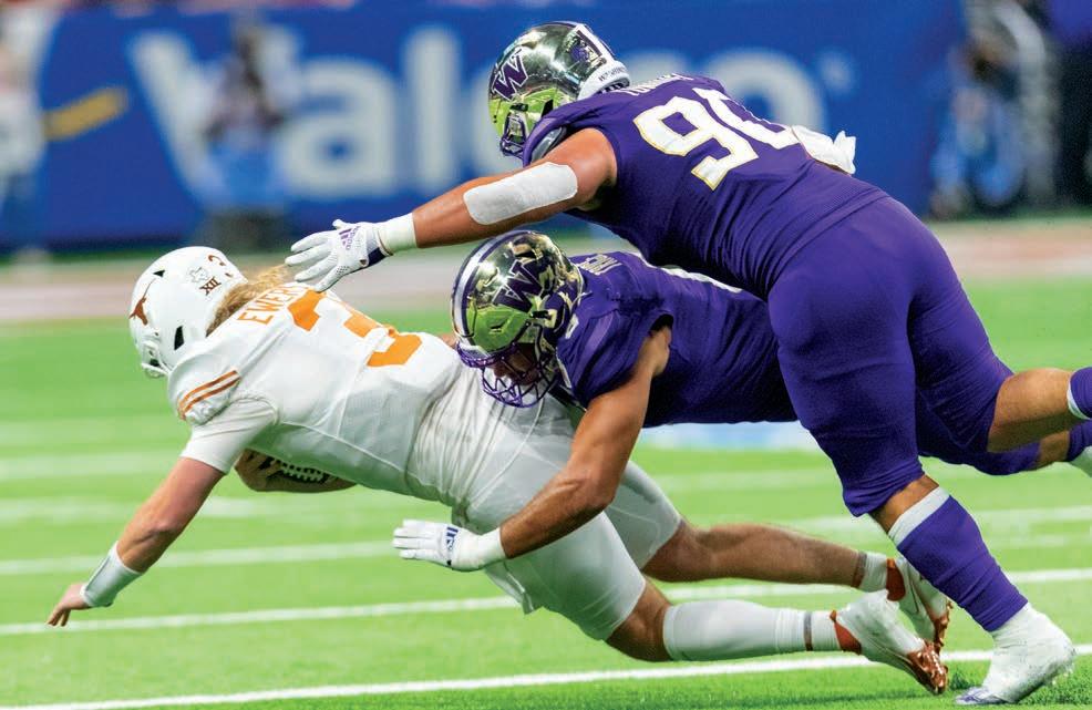 Led by defensive lineman Voi �unuufi (90), the Huskies smothered the �exas offense during their 27-20 Alamo Bowl victory. Story, Page 22.