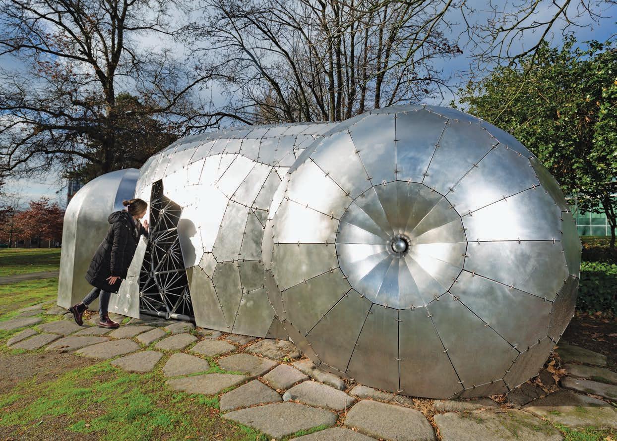 Department of what? Morphology: the study of form. Forensic: referring to criminal evidence. “I believe the field of forensic morphology is still in its infancy, but as it matures, I imagine it will focus on examining forms for evidence,” says Cris Bruch, the artist behind the stainless-steel sculpture behind William H. Gates Hall. Inspired by the Theodor Jacobsen Observatory and the F.K. Kirsten