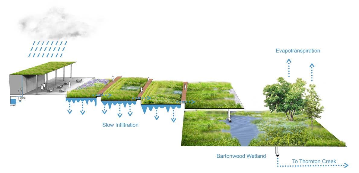 Stormwater management will benefit the community in myriad ways. The proposed system. integrates the existing topography with native vegetation, to provide resilience and a more sustainable landscape that improves wildlife habitat. Also the designs explore how to connect green infrastructure in this area to accept stormwater runoff from the community center rooftop and roads.