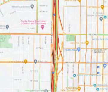 The northwest quadrant of the site is a quieter, more intimate space. A twoway bike lane running along 5th Avenue creates a north/south commuter connection for the site. Existing street trees are retained and a bioswale is added in the chicane bump-outs, which slow down the car traffic to enhance the biker and pedestrian experience and add green space to the nearby residences. The southbound on-ramp is concealed under the high point of the site, which is covered in a dense Pacific Northwest evergreen ecosystem. Pedestrian connections take the form of winding hiking trails through the forest. By narrowing the road, increasing the bike lane, and providing multiple pedestrian pathways, we hope to encourage a mode shift away from a carcentric way of life. We acknowledge that while we cannot completely erase cars, we can make it more favorable to bike, bus and walk.