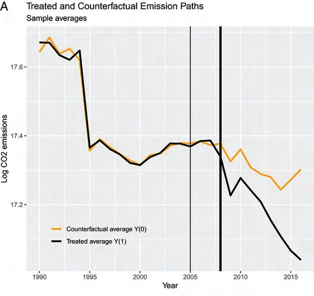 Figure 1. Effect of the EU ETS over time. The mean CO2 emissions paths for actual (black line) and counterfactual (yellow line) emissions. The thin and thick black lines mark years 2005 (start of pilot period) and 2008 (start of second trading period). Source: https://www.pnas.org/content/117/16/8804