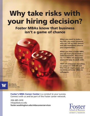 Why take risks with your hiring decision? Foster MBAs know that business isn’t a game of chance When you need to make a key hire, you want someone who can roll up their sleeves and add immediate value to your organization. When you hire a Foster MBA, you can trust you’ve made a solid investment. Recruiters say our MBAs are seasoned, smart and easy to work with. 100% of companies recruiting on campus in 2008-09 said they would return again and recommend Foster MBAs to colleagues.