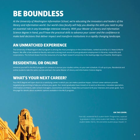BE BOUNDLESS At the University of Washington Information School, we’re educating the innovators and leaders of the library and information world. Our world-class faculty will help you develop the skills you need to play an essential role in any knowledge-intensive industry. With your Master of Library and Information Science degree in hand, you’ll have the practical skills to advance your career and the confidence to make bold decisions that deliver impact and transform institutions in a rapidly changing landscape.