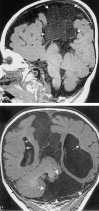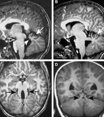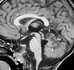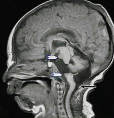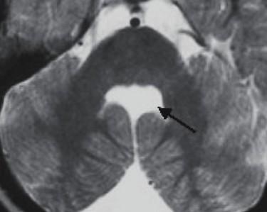 White arrows: Small pons remnant with nonformation of the midportion of the brainstem