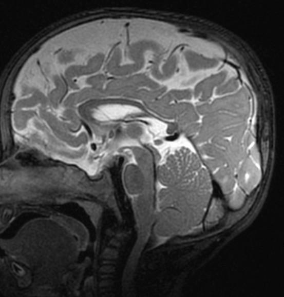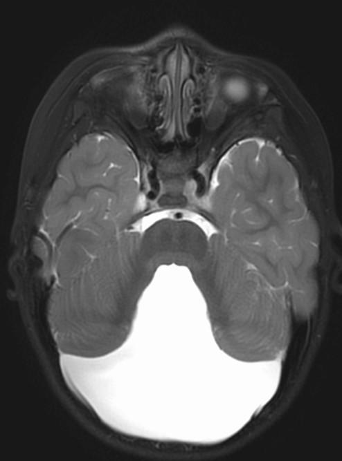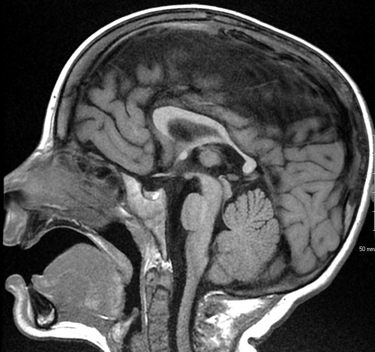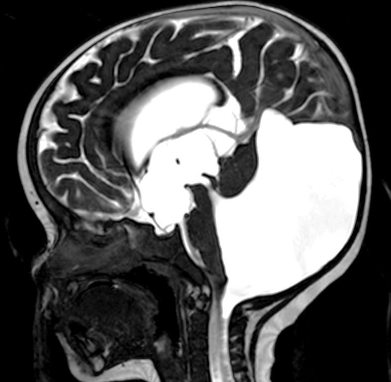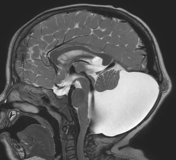 Hint: Normally formed Vermis which is pushed forward DDX: mega cisterna magna (no mass effect on the vermis) versus Blake’s pouch cyst (mass effect on inferior vermis pushing vermis superiorly.)