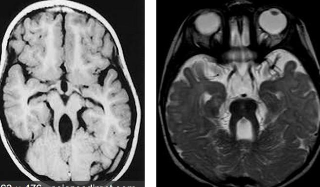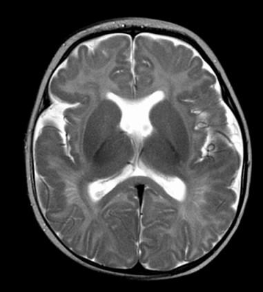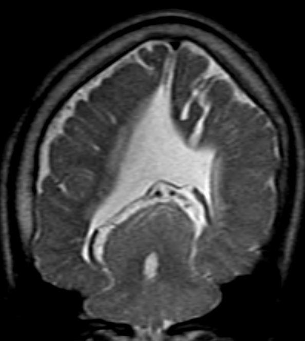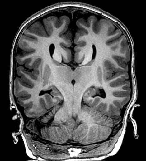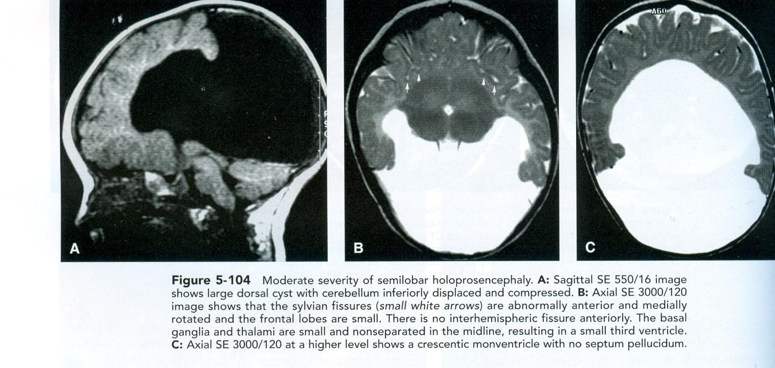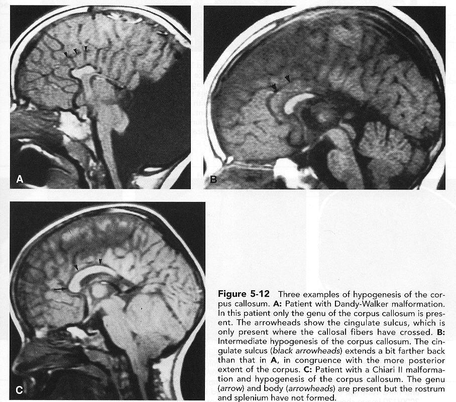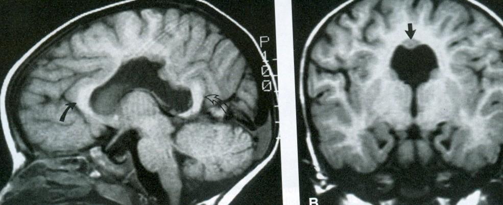 “Missing”=disorganized rostrum, genu, anterior body of the corpus callosum Cortex of the anterior medial frontal lobes “too thick” with fused grey matter across the anterior midline where the “genu” should be.