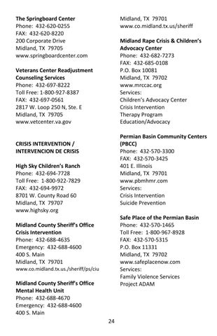 Midland County Sheriff’s Office Crisis Intervention Phone: 432-688-4635 Emergency: 432-688-4600 400 S. Main Midland, TX 79701
