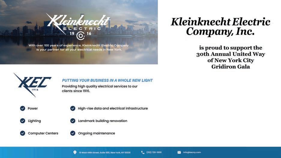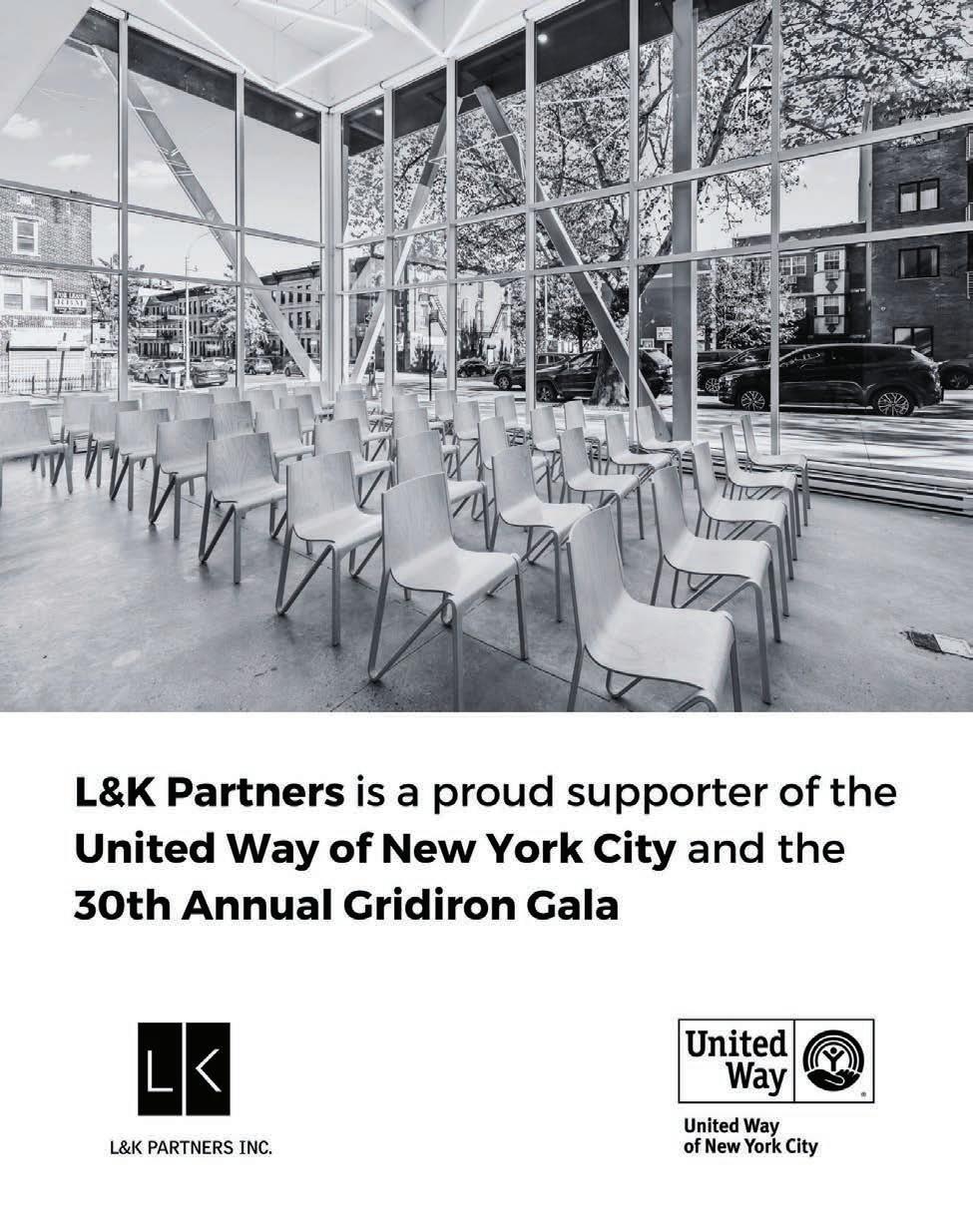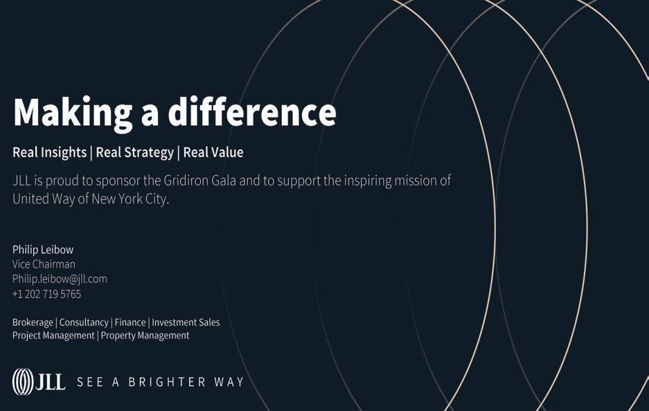 Sponsor Torys LLP is proud to sponsor the 30th annual Gridiron Gala and support the important work of the United Way of NYC. We salute the UWNYC for its dedication to strengthening and supporting the most challenged neighborhoods throughout the city. We are a team of 450+ expert-led specialists across banking, asset and investment management, Asset Management Fin Crime & Compliance Banking & Markets Learning & Development & Private Banking Professionals Client re of clients commission Assignments in Active engagement experience across Managing Partners WE ARE PROUD TO SUPPORT THE The United Way of New York City’s 30th Annual Gridiron Gala AND CONGRATULATE ALL THE HONOREES weil.com Weil, Gotshal & Manges LLP White & Case congratulates White & Case is proud to support the great mission of the United Way of New York City and congratulates The George Irish MVP Award honoree Brad Rothbaum, as well as the other Gridiron Gala honorees, on their exceptional accomplishments and recognition. We greatly value of our longstanding relationship with BMO Capital Markets and our collective commitment to this impactful cause. As a pioneering international law firm, we help our clients achieve their ambitions across the world’s developed and emerging markets. whitecase.com