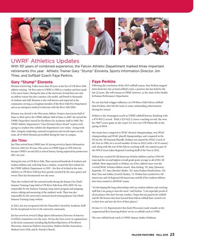 UWRF Athletics Updates With 101 years of combined experience, the Falcon Athletic Department marked three important retirements this year: Athletic Trainer Gary “Stump” Eloranta, Sports Information Director Jim Thies, and Softball Coach Faye Perkins.