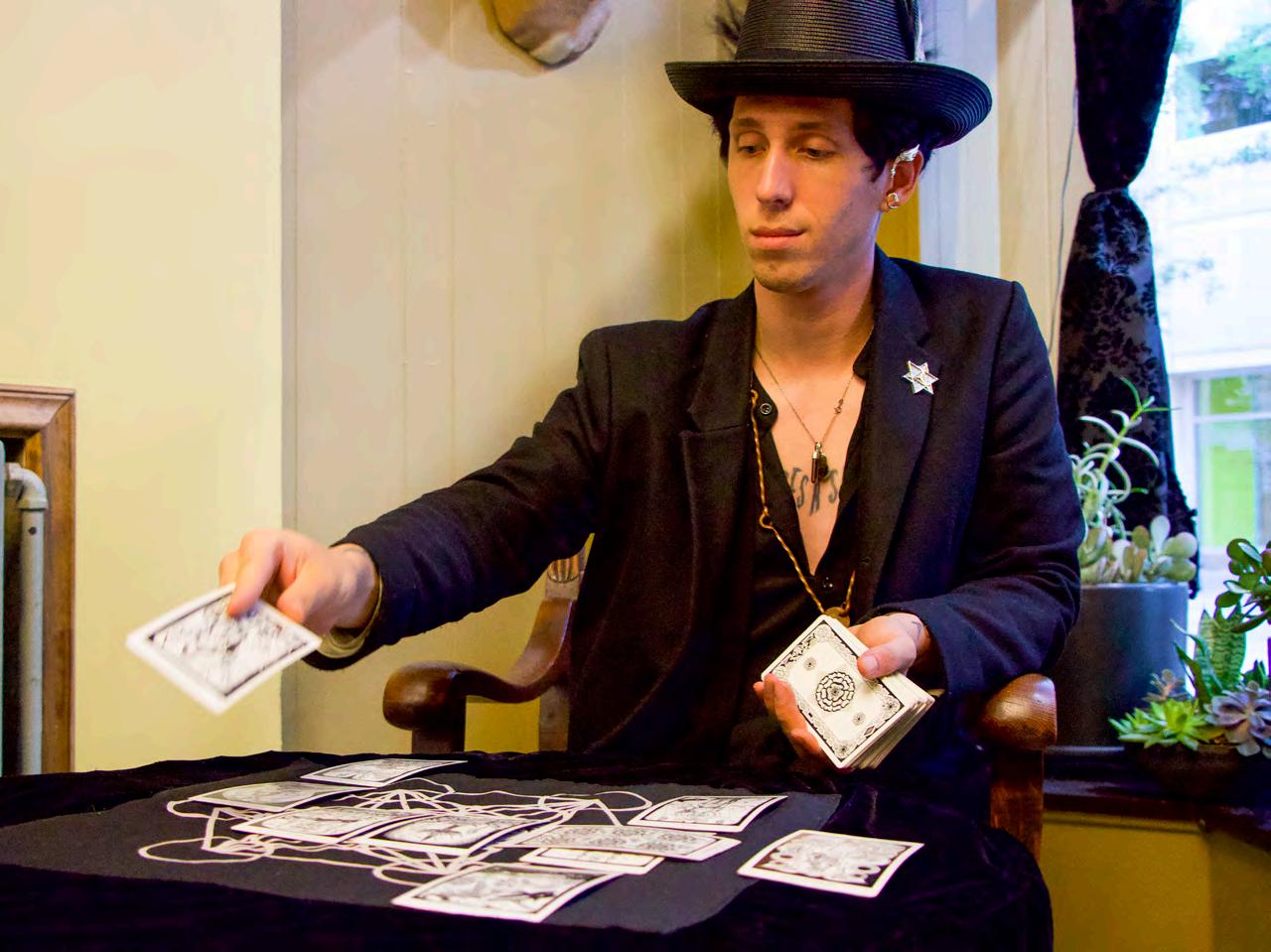 While he waits for his hands to fully heal, Abraxas is mastering the scheduling and communications while developing his divination abilities as Ritual Moon’s resident psychic. He has been reading tarot since age 14 and is studying other forms of spiritual readings to perform at Ritual Moon, such as astrology and palmistry.