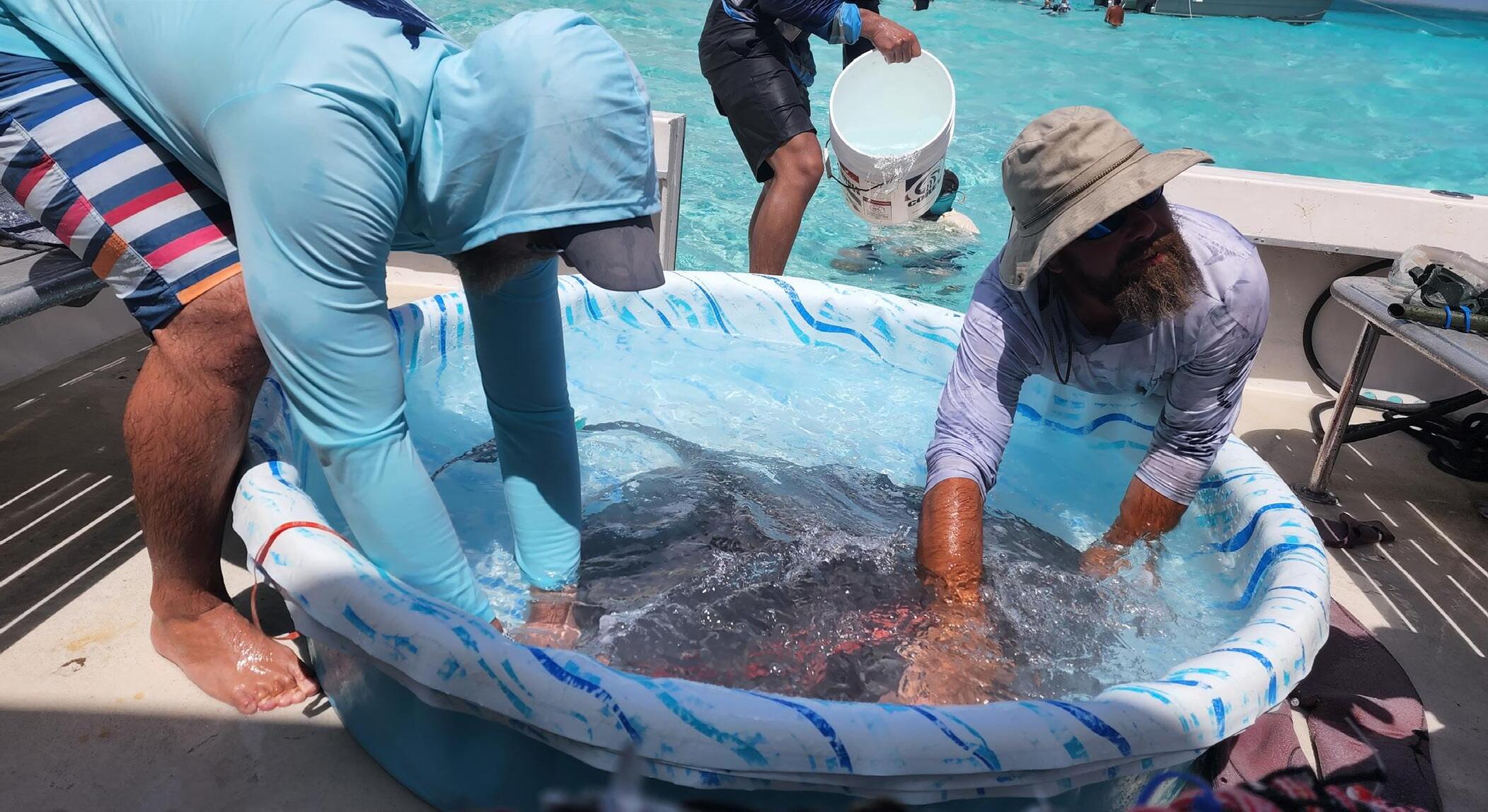 Above: Ben Stading (left) assists with the Guy Harvey Foundation stingray health surveys at Stingray City on Grand Cayman