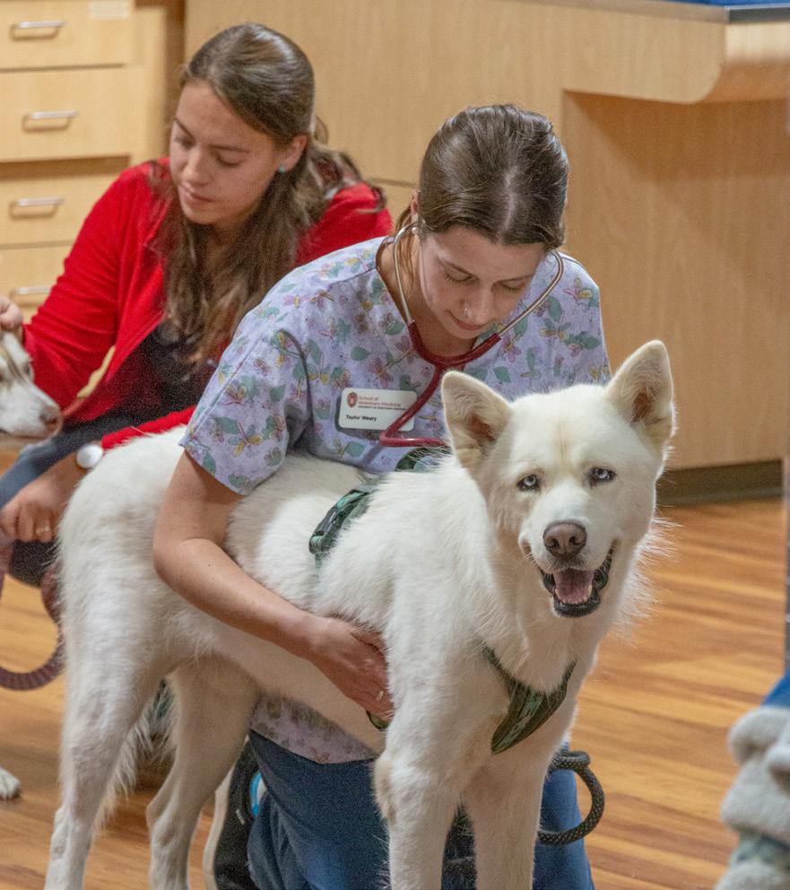 Right: Taylor Weary (DVM’25) performs an exam on a Husky at the WisCARES clinic in Madison.