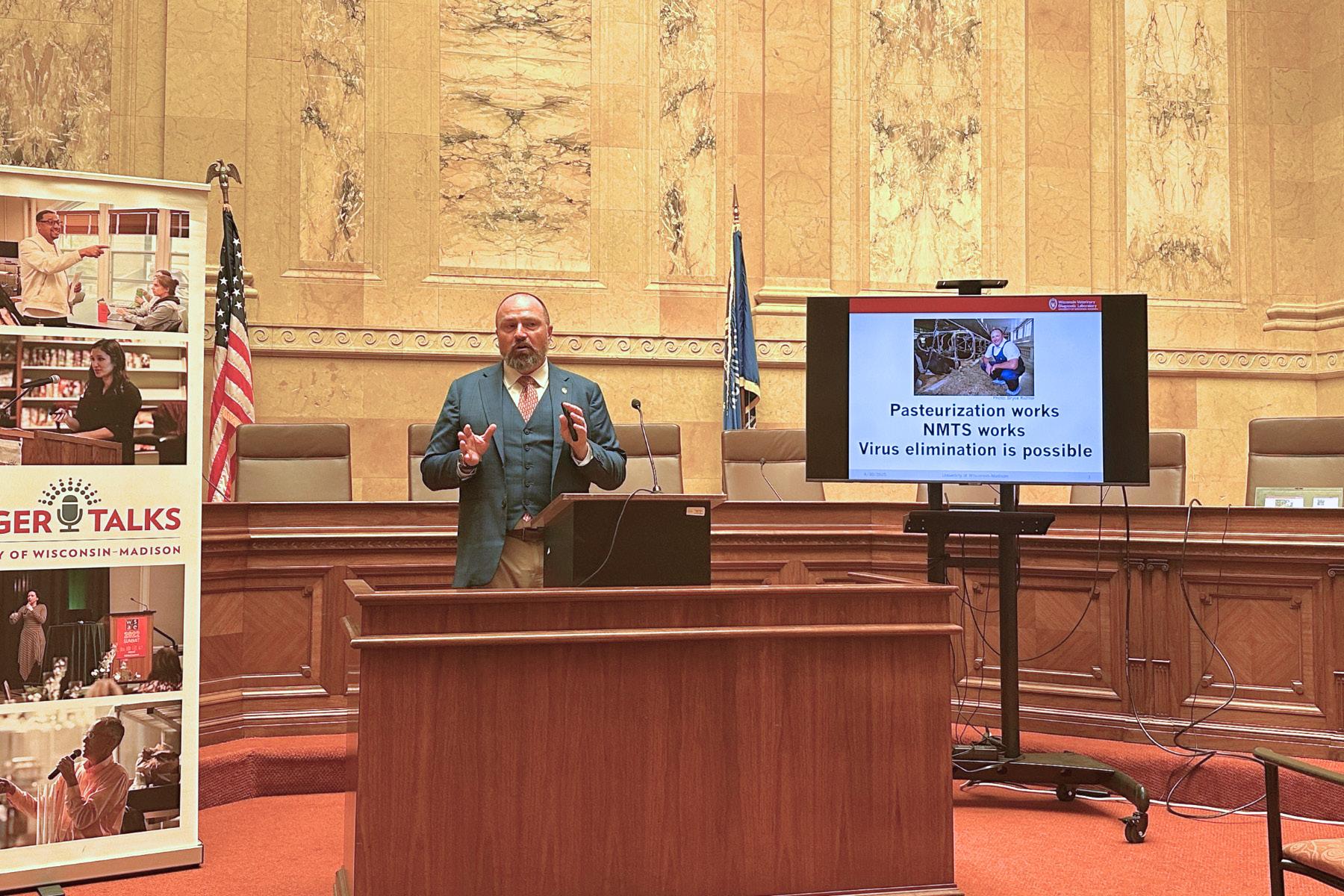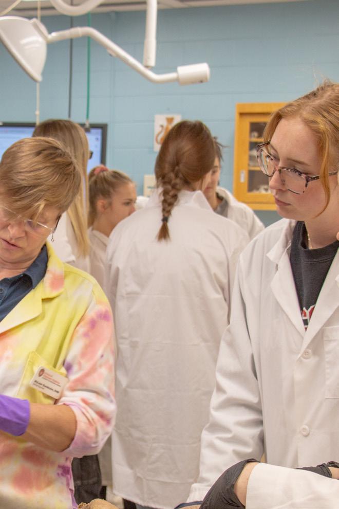Middle: McLean Gunderson (‘97; Department of Comparative Biosciences) speaks with students during a large animal anatomy lab session.