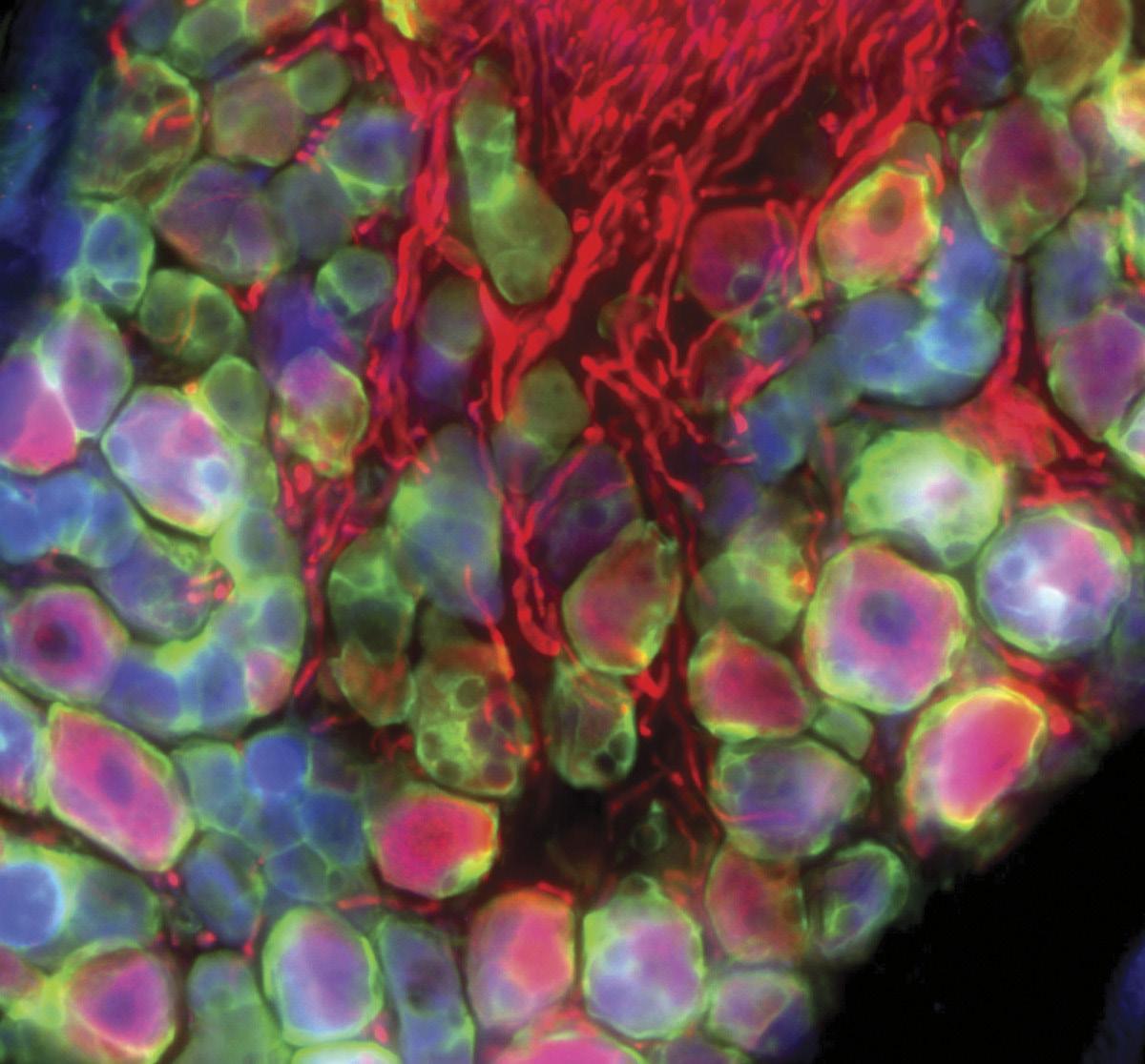 Right: A bundle of mouse nerve cells (distinguished by different colors) is wrapped in signal-regulating cells, which are shown in green and called satellite glia. These bundled neurons carry signals from the body to the brain via their long, red extensions known as axons.