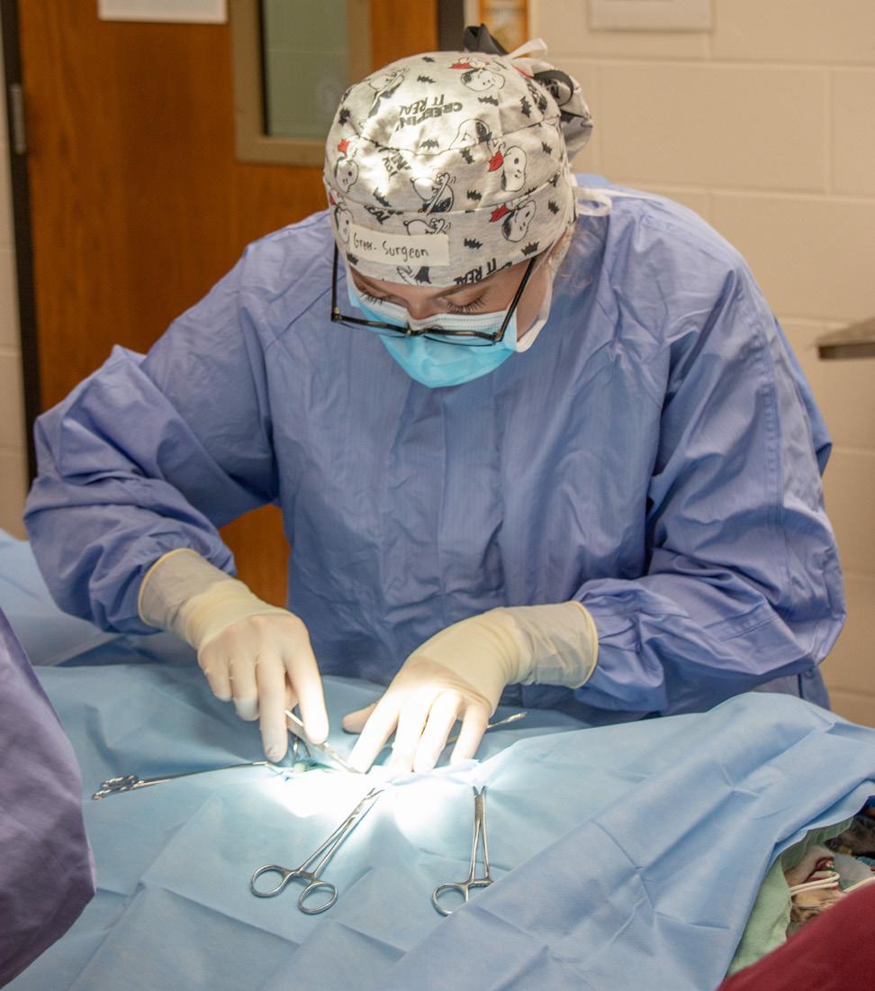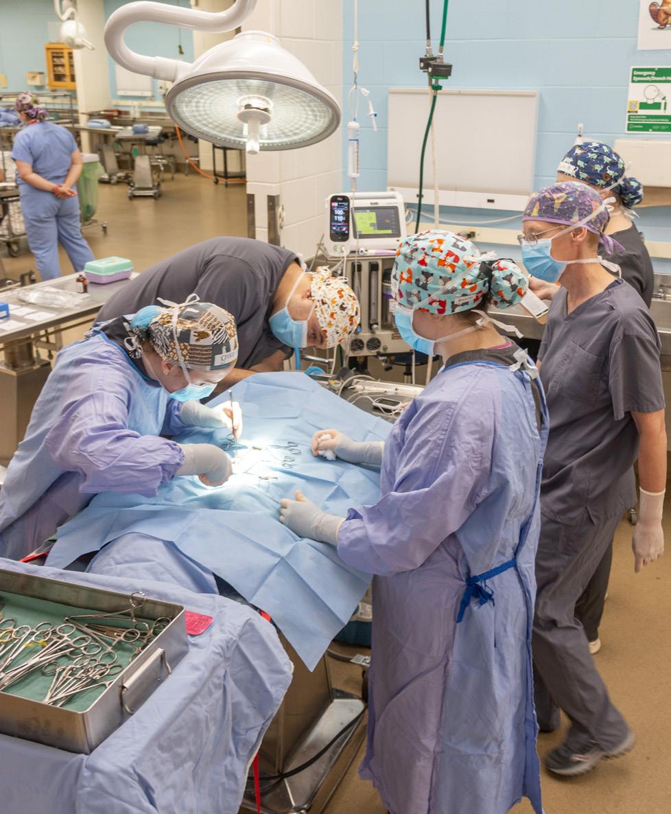 Each year, third-year students at the UW School of Veterinary Medicine enroll in the school’s junior surgery course — a major milestone in their veterinary medical education. Working in teams of four, the students care for a feline patient through the entire spay surgery process, under the guidance of faculty and teaching staff. Page 12