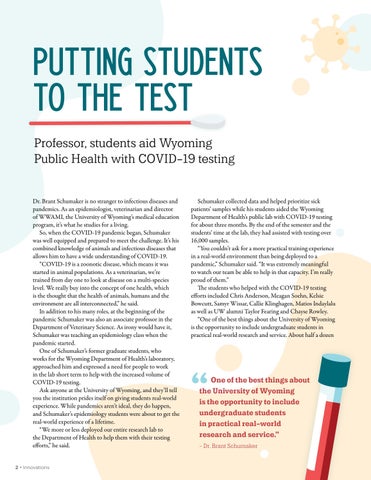 PUTTING STUDENTS TO THE TEST Professor, students aid Wyoming Public Health with COVID-19 testing Dr. Brant Schumaker is no stranger to infectious diseases and pandemics. As an epidemiologist, veterinarian and director of WWAMI, the University of Wyomingâs medical education program, itâs what he studies for a living. So, when the COVID-19 pandemic began, Schumaker was well equipped and prepared to meet the challenge. Itâs his combined knowledge of animals and infectious diseases that allows him to have a wide understanding of COVID-19. âCOVID-19 is a zoonotic disease, which means it was started in animal populations. As a veterinarian, weâre trained from day one to look at disease on a multi-species level. We really buy into the concept of one health, which is the thought that the health of animals, humans and the environment are all interconnected,â he said. In addition to his many roles, at the beginning of the pandemic Schumaker was also an associate professor in the Department of Veterinary Science. As irony would have it, Schumaker was teaching an epidemiology class when the pandemic started. One of Schumakerâs former graduate students, who works for the Wyoming Department of Healthâs laboratory, approached him and expressed a need for people to work in the lab short term to help with the increased volume of COVID-19 testing. Ask anyone at the University of Wyoming, and theyâll tell you the institution prides itself on giving students real-world experience. While pandemics arenât ideal, they do happen, and Schumakerâs epidemiology students were about to get the real-world experience of a lifetime. âWe more or less deployed our entire research lab to the Department of Health to help them with their testing efforts,â he said. 2 ⢠Innovations
