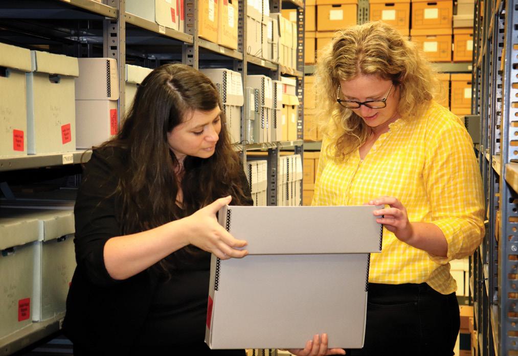 Davis (left) and Gattermeyer examine part of an archive collection at the American Heritage Center.