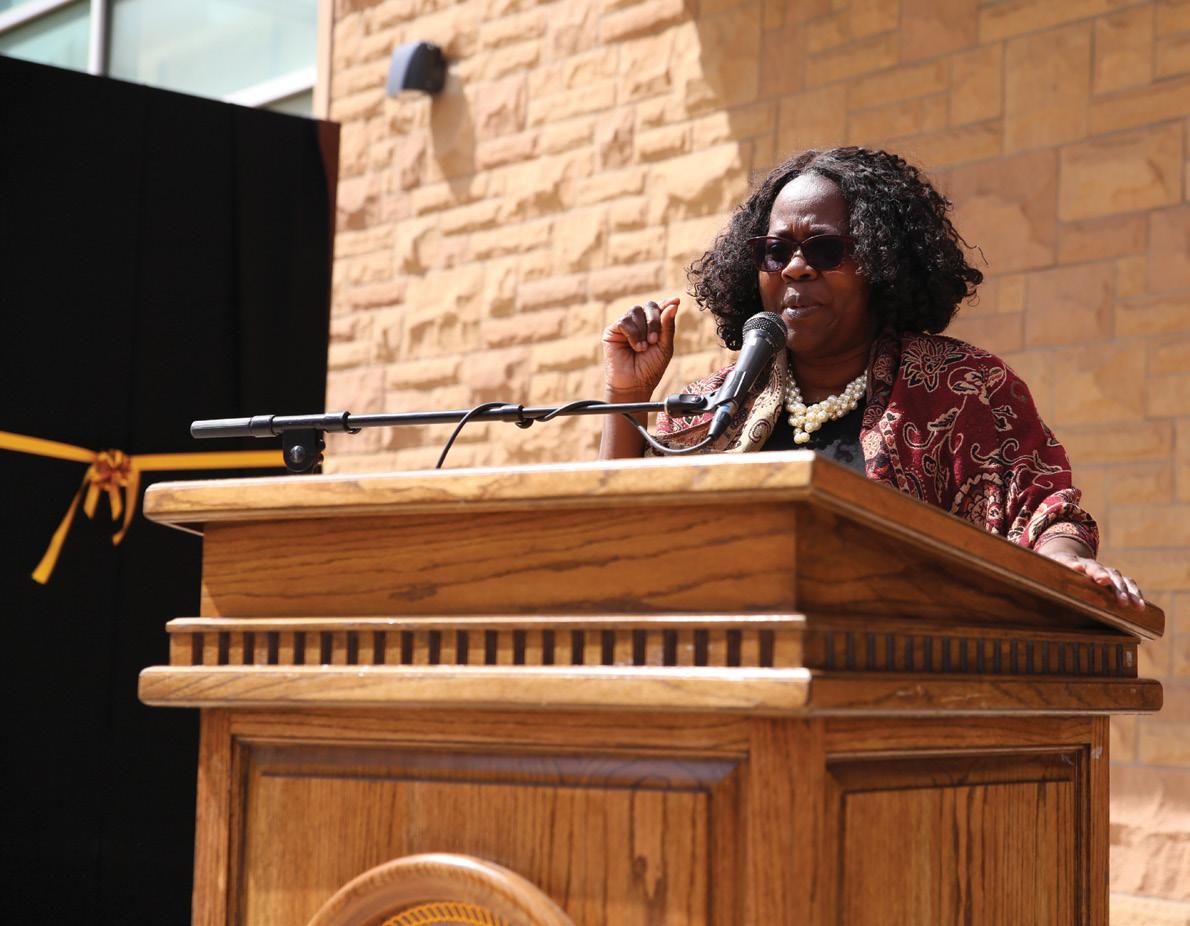 Left: Former Department Head of Anthropology Todd Surovell and Julie Francis, along with friends, colleagues and former students, gathered to celebrate the legacy of George C. Frison during the renaming ceremony. Right: Former Dean Camellia Moses Okpodu spoke about the inspiration she drew from Frison’s work.