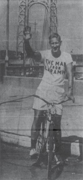 University of Wyoming law student William Grant waves as he arrives at New York’s George Washington Bridge on August 25, 1955, completing a 2,400-mile bicycle journey from Laramie. He began the ride on July 17 to promote “The Man from Laramie,” a Western film starring James Stewart, released just days later on Aug. 31.