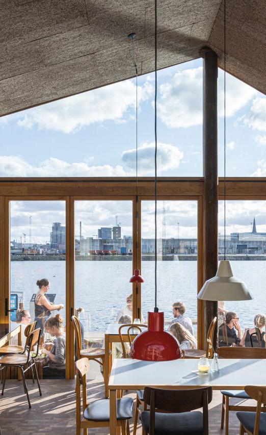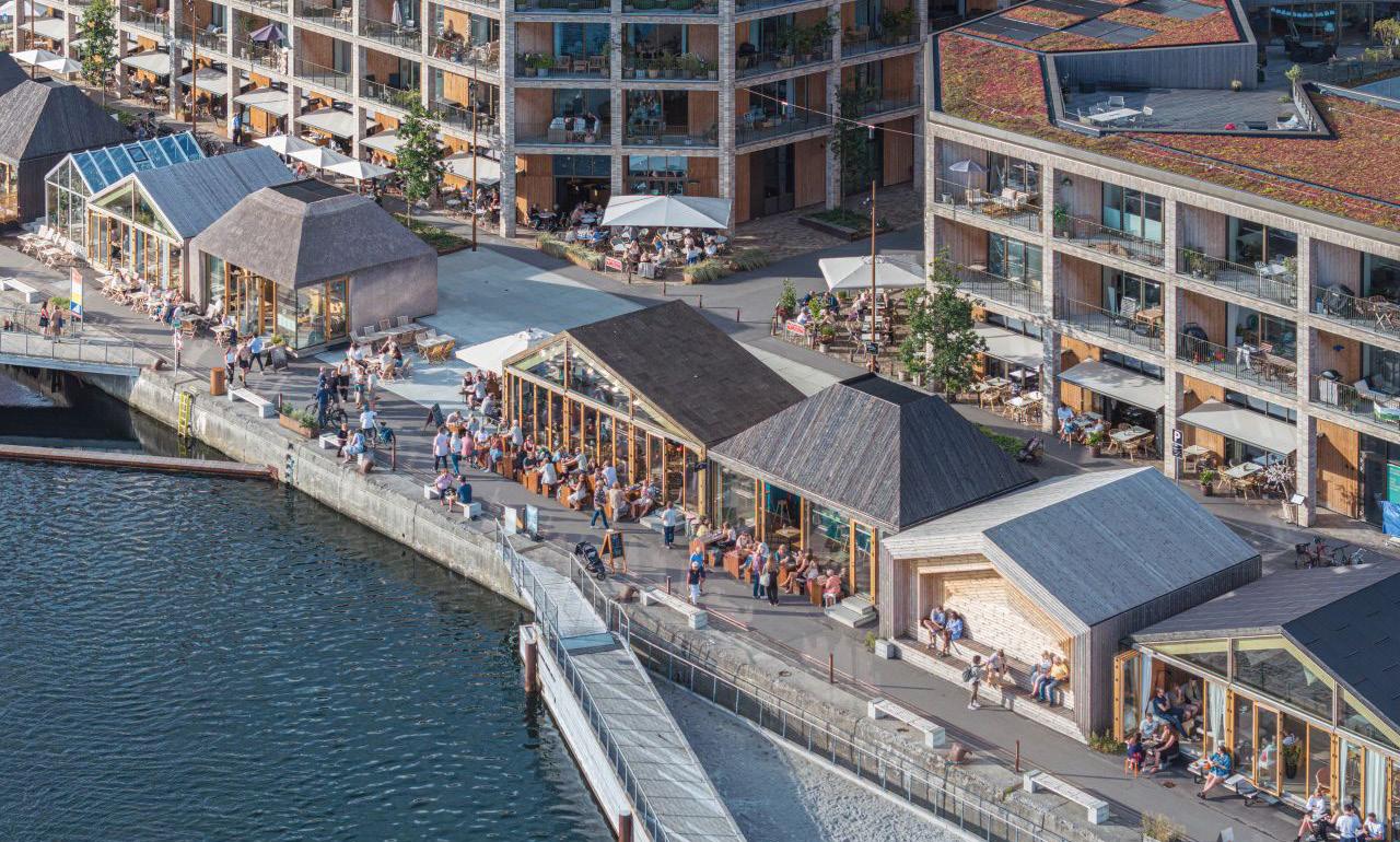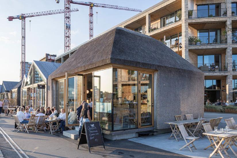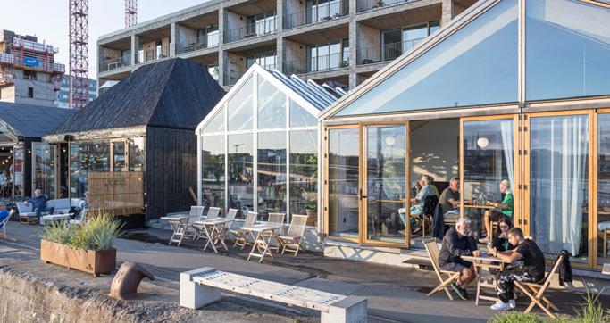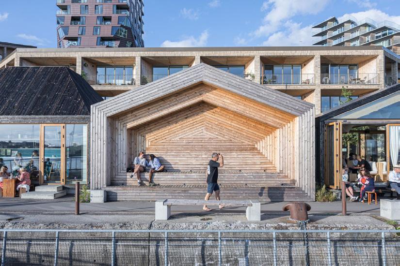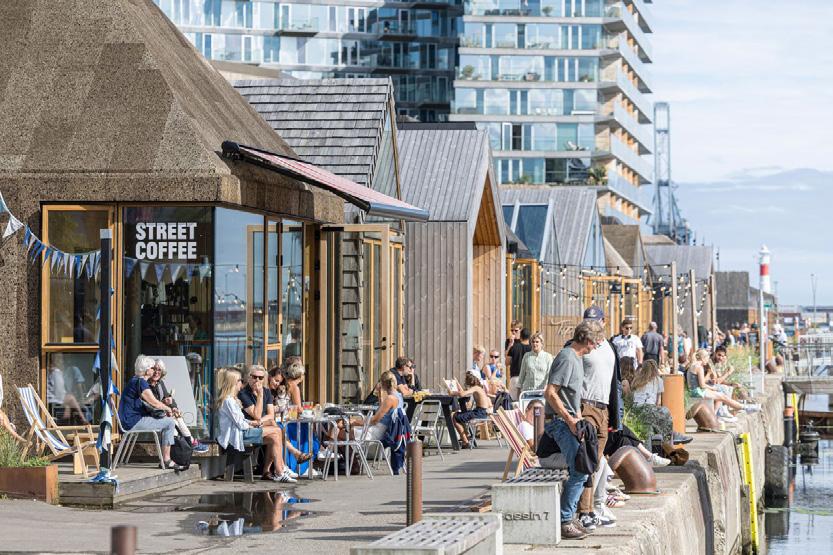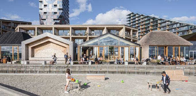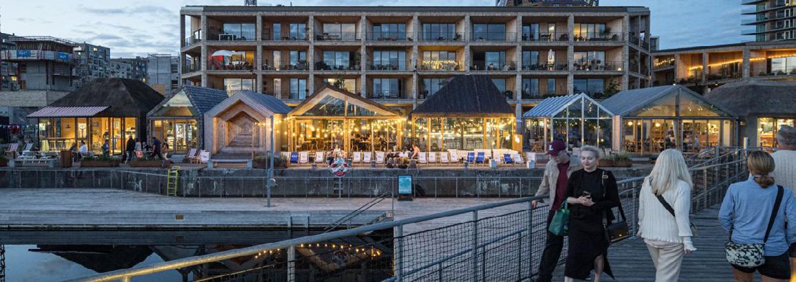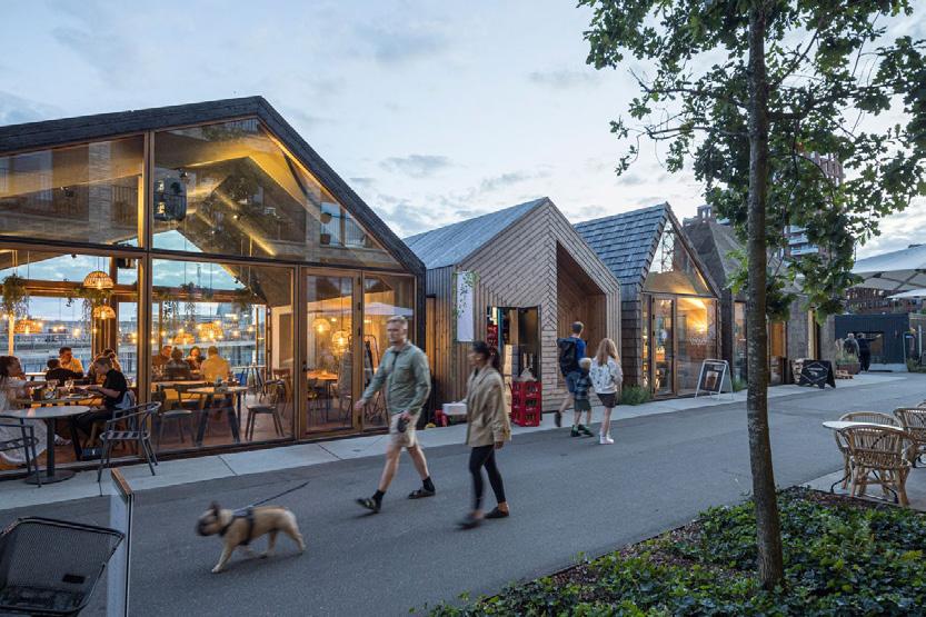 cial and residential developments into the remaining areas. A key addition to the masterplan is the Urban Life Houses—a row of 13 unique units, each distinguished by its architectural character and materiality, incorporating elements such as cork, charred and reused wood, and thatched straw. Positioned at the waterfront’s edge, these structures foster a vibrant mix of cafés, restaurants, and bars, enhancing the social and cultural life of the district. Seamlessly complementing the adjacent Harbor Bath, the Urban Life Houses further strengthen the connection between the city and the sea, embodying the vision of a thriving, accessible, and sustainable waterfront for generations to come.
