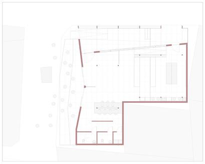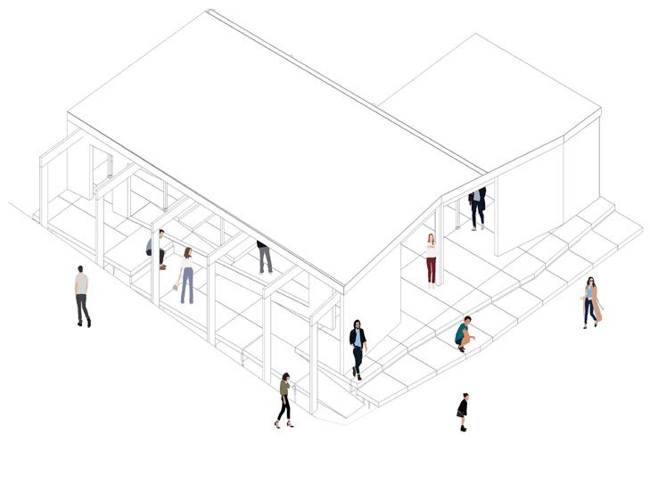 The design strategy is shaped by both the site’s characteristics and the pavilion’s intended function. Given the area’s context, the primary focus was to create open spaces that promote natural ventilation and facilitate smooth circulation. Additionally, elevation was incorporated as a key design element, resulting in three distinct levels: the street level, the lower section, and the elevated platform. Through this tiered approach and a precise modular system, the pavilion generates diver-