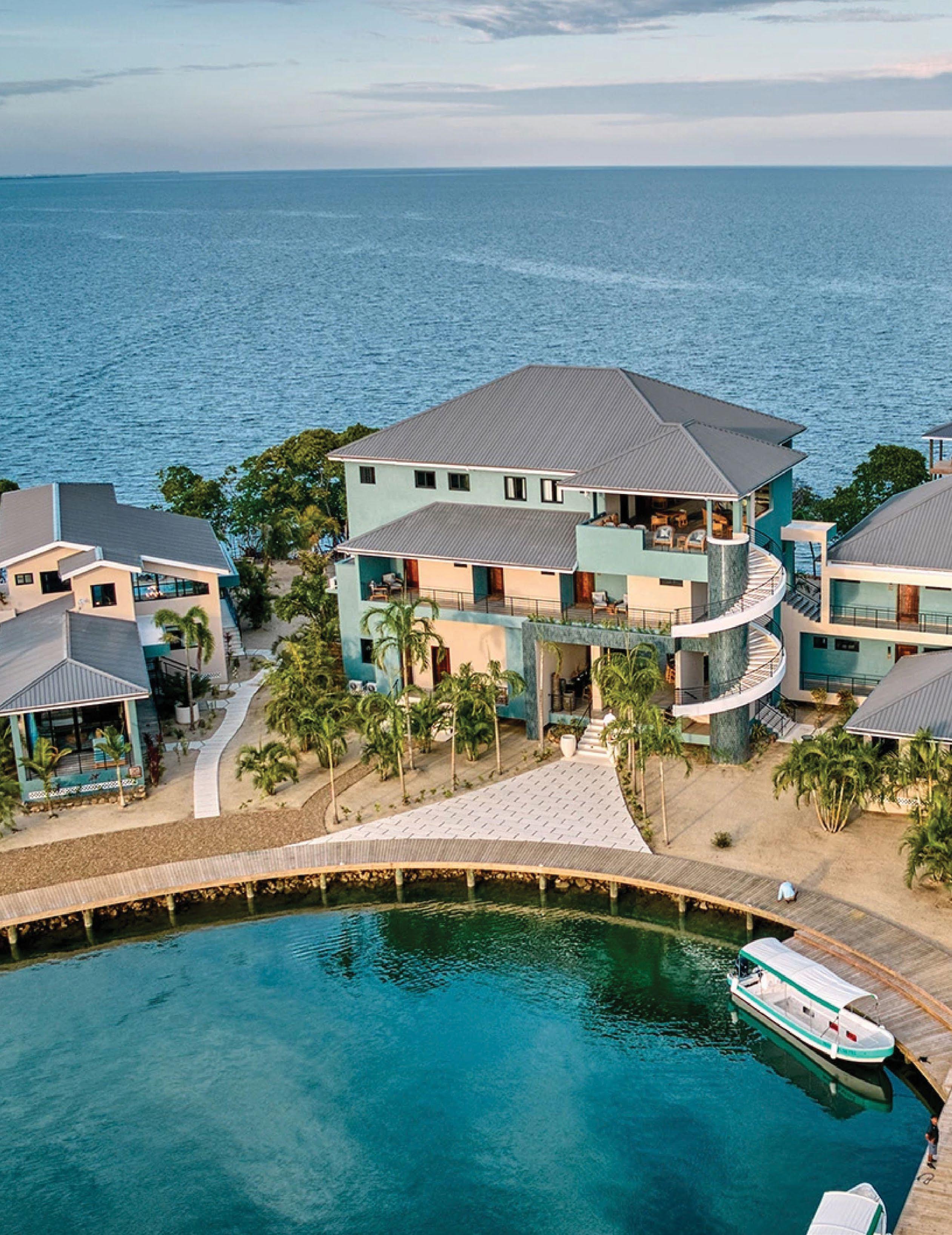 The resort is located on a small island, Placencia Caye, and consists of a main inn with ten 800-square foot suites and six two-story, three- and fourbedroom villas ranging from 3,000 to 5,000 square feet. In addition to the restaurant and bar, the main inn houses a fitness room, a full-service spa (one of the largest in Belize), and a pool. The resort also offers free kayaks, paddleboards, and water bikes for guests to use and even provides equipment for fishing off the inn’s dock, which juts into the Caribbean.
