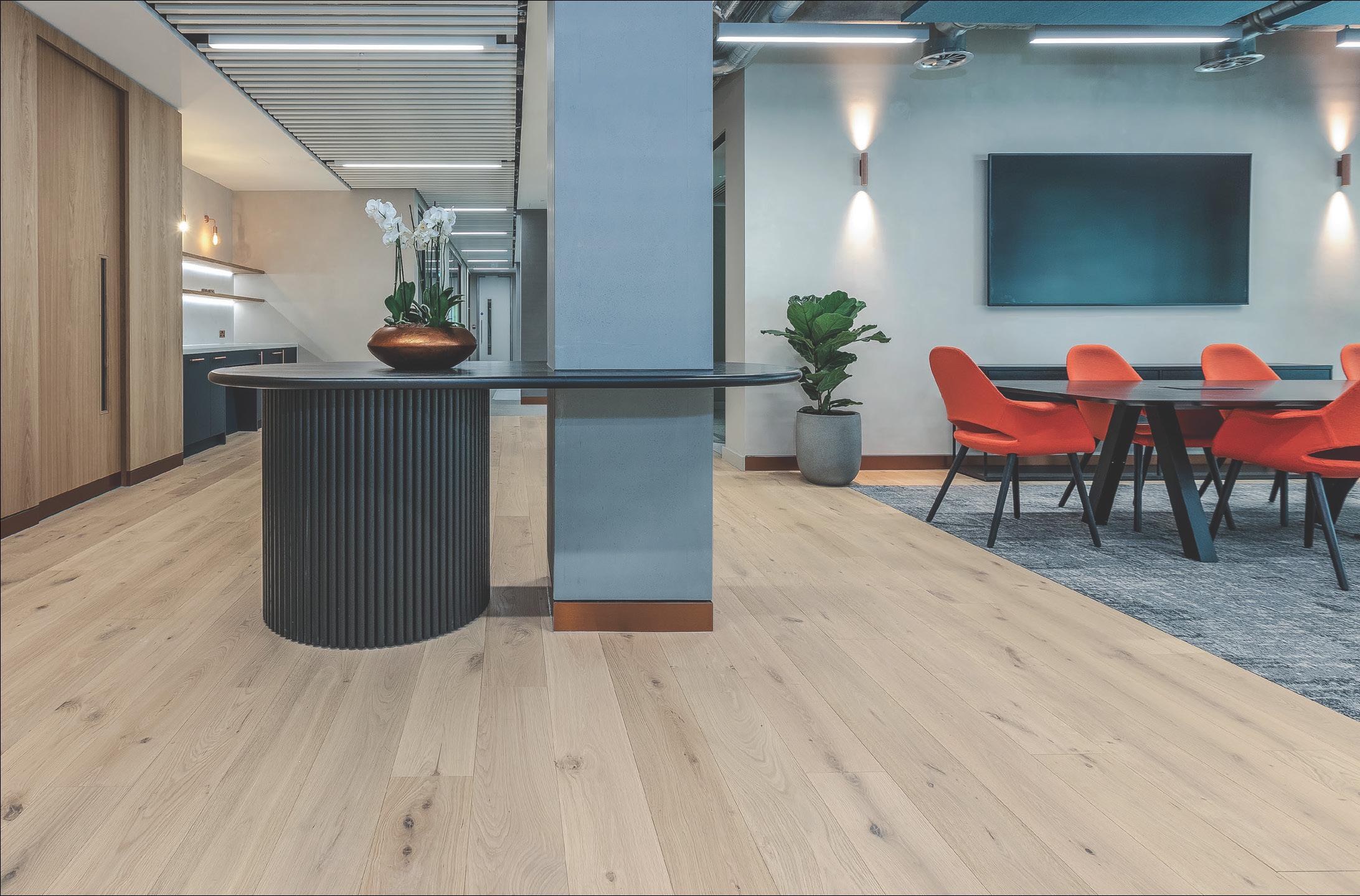“In designing the client business lounge, our aim was to cultivate a timeless and sophisticated ambience. The choice of Shore Drift Oak flooring struck the ideal harmony, blending warmth and texture to craft an environment that is both welcoming and professional. The client sought to imbue their 1st-floor business lounge with a sense of luxury and natural elegance, ensuring a welcoming reception for their clientele.”