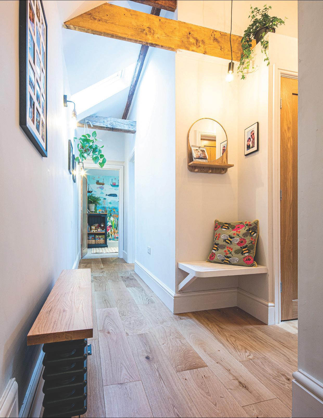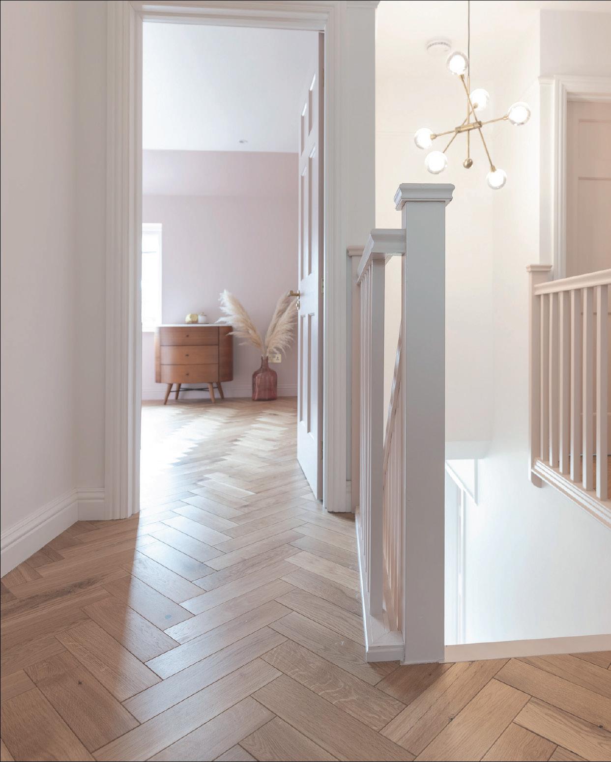 "We chose oak chevron and plank in ‘Seashell,’ which is a beautiful creamy light wood – not too orange nor too grey! It’s the perfect sandy beige for the tones I wanted to achieve, with a stunning grain throughout. I opted for the Seashell plank upstairs, and I couldn’t be happier with the overall look, feel, and installation when the sun shines in and I see my girls thrive in the home I’ve designed for us I feel moments of calm."
