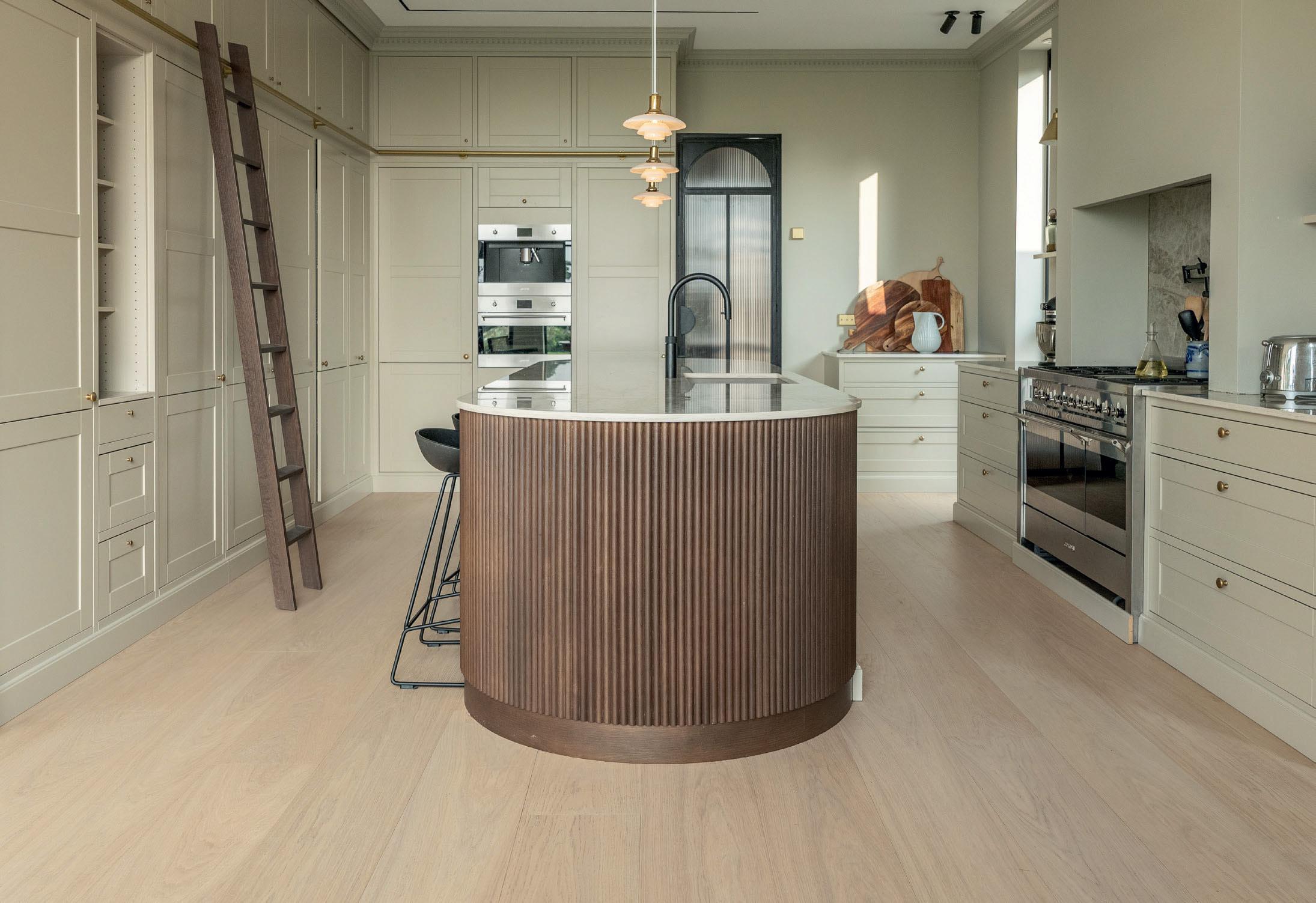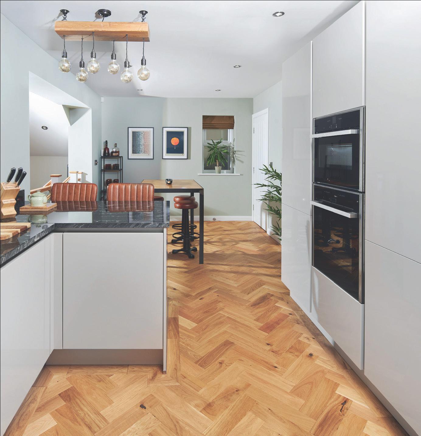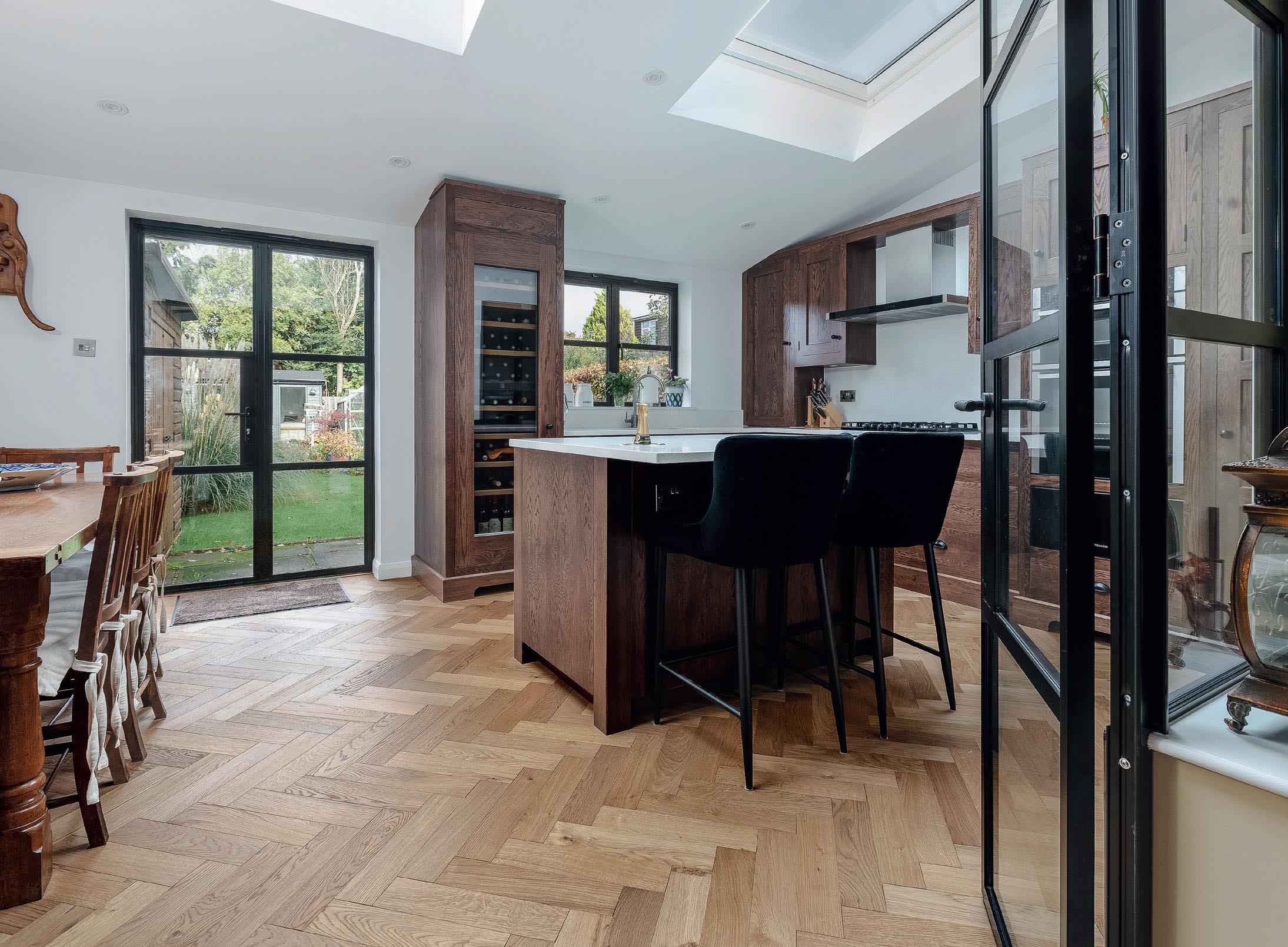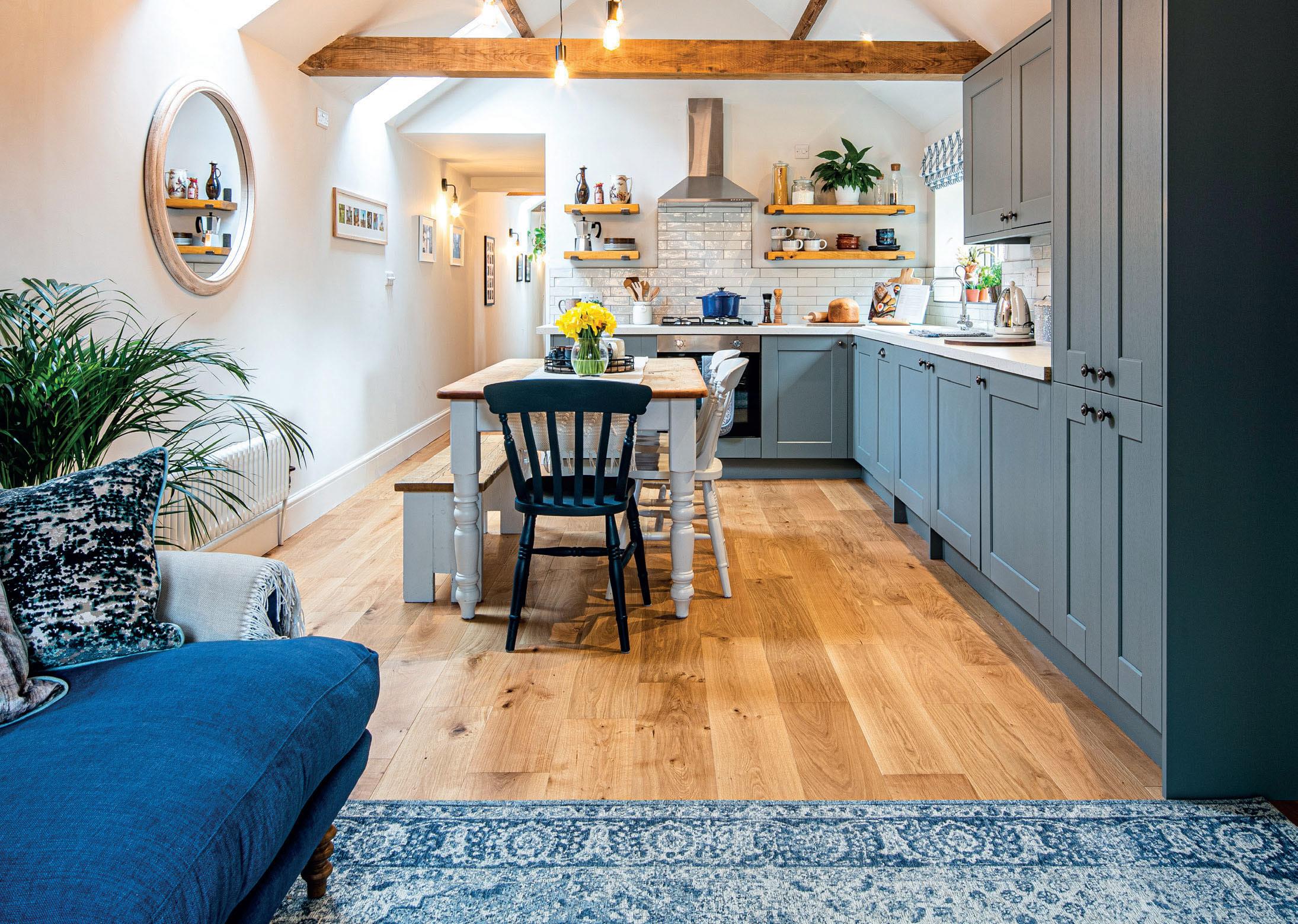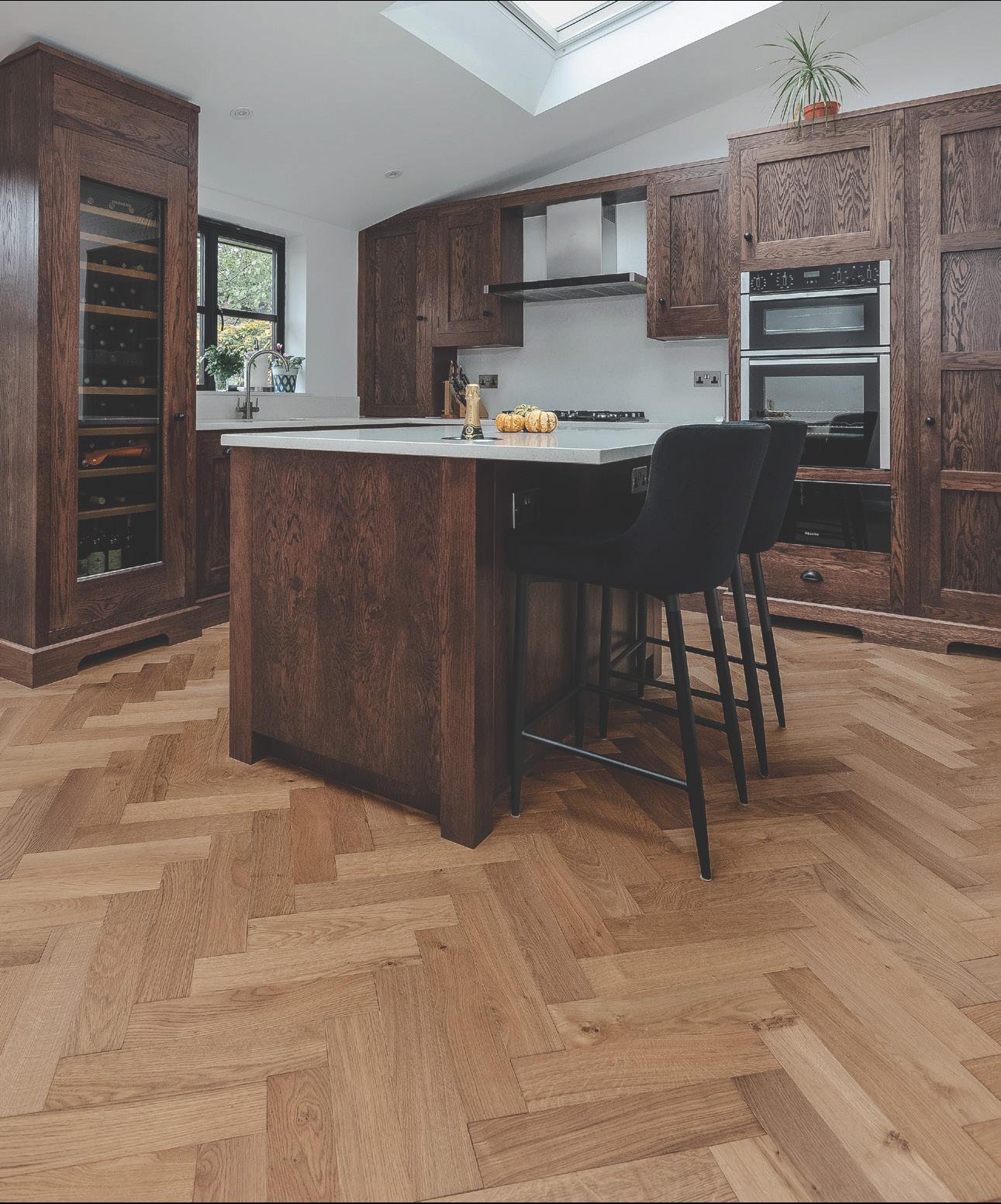 Seamlessly blending with the rustic oak beams adorning the ceiling, the random length engineered oak planks crafts a delightful fusion of traditional kitchen style with a modern design."