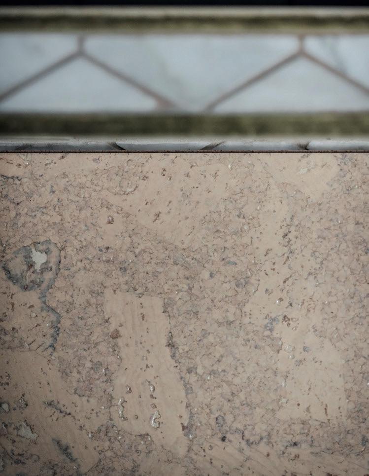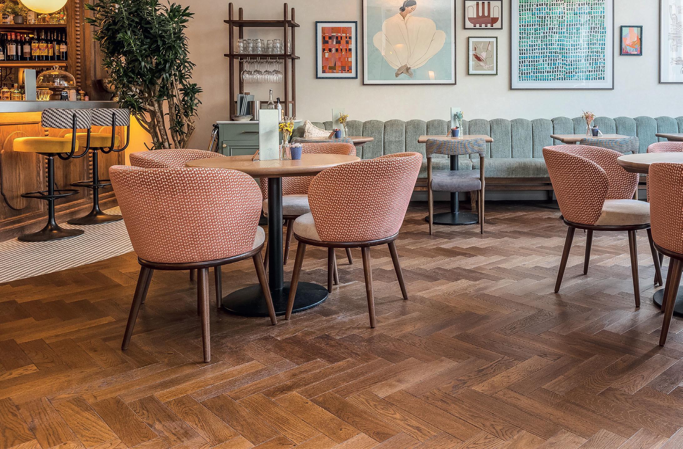 “New to the Deco collection and available in both plank and engineered herringbone, Tannery Brown is a subtly distressed oak floor with an abundance of rustic charm. With tumbled edges and a pitted surface, the oak boards have an aged appearance that provides the perfect base note for the opulent ‘speakeasy’ styling of the Coppa Club.”