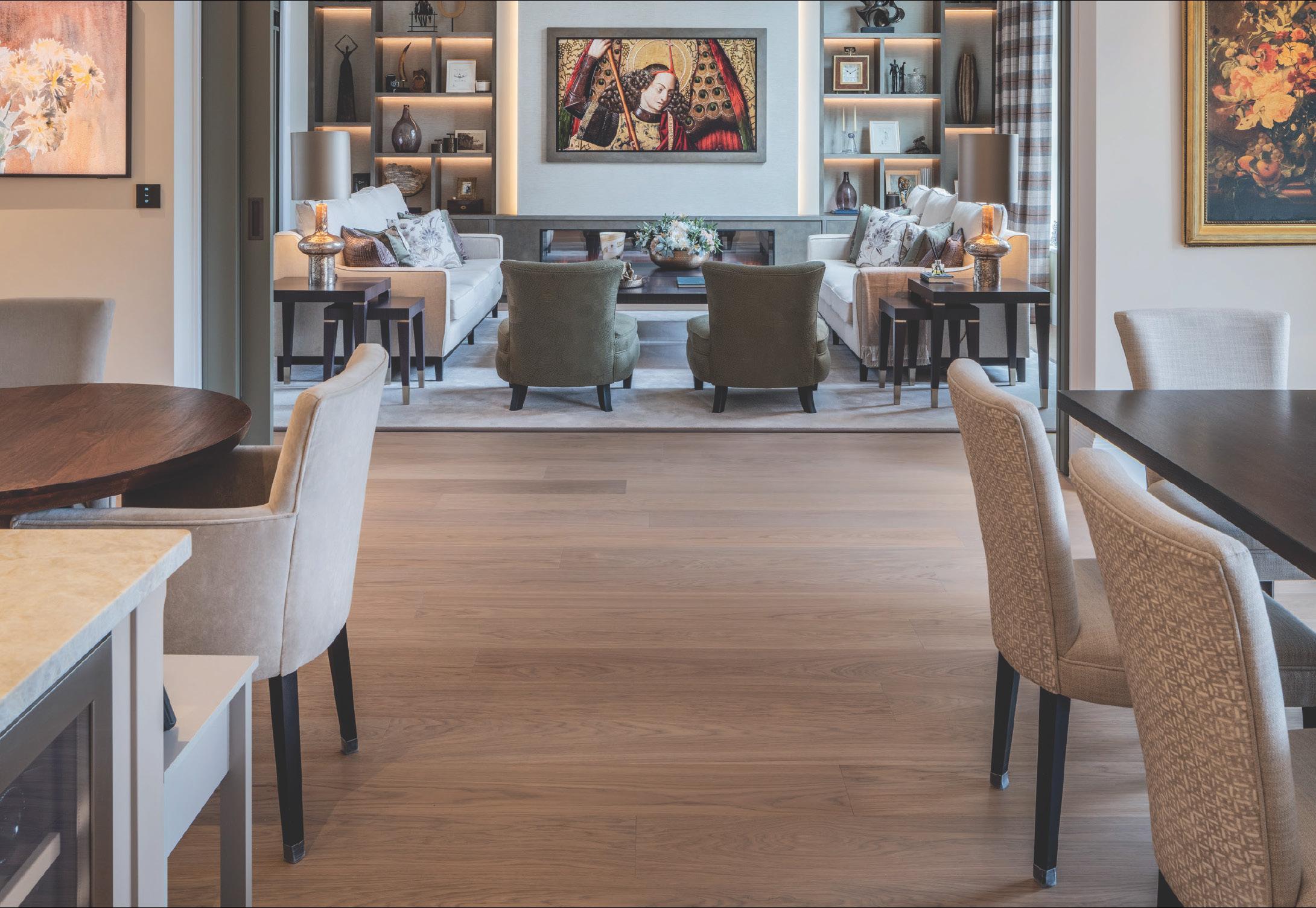 “The floors blend effortlessly with the inside space, working alongside the soft hues used throughout the apartments interior design and finishes, but also create an harmonious connection to the silver ripples reflecting from the outside river scape.”