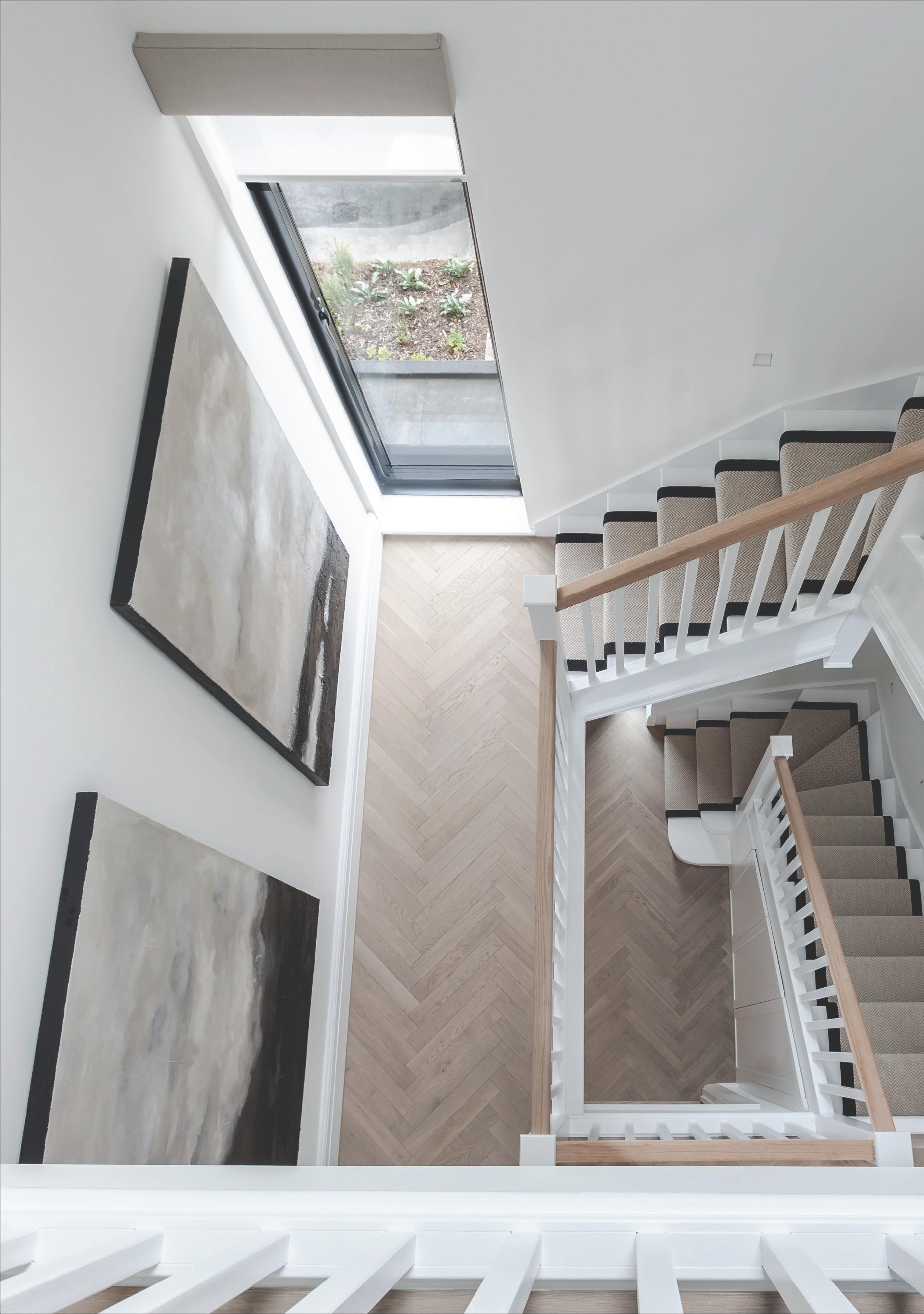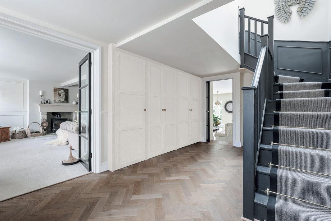 “One of the things I was so pleased about with V4 Wood flooring was the matching stair nosings. I always wanted to have wall to wall herringbone downstairs… I went with oak planks in the bedroom, but I was worried as I wanted to keep the flow of the wood throughout. I didn’t realise V4 did the treads, risers, and bullnose edgings, it was amazing to hear they did that match the parquet and the wooden floor colours.”