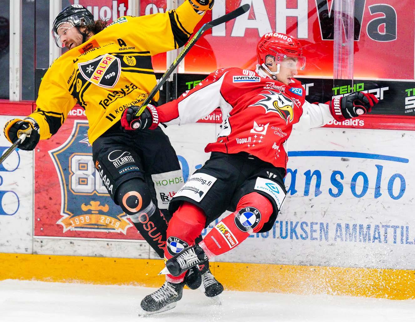 Kapteeni Erik Riska ei kaihda fyysistä peliä. Tässä yhteenottoa KalPan Ryan Wilsonin kanssa.