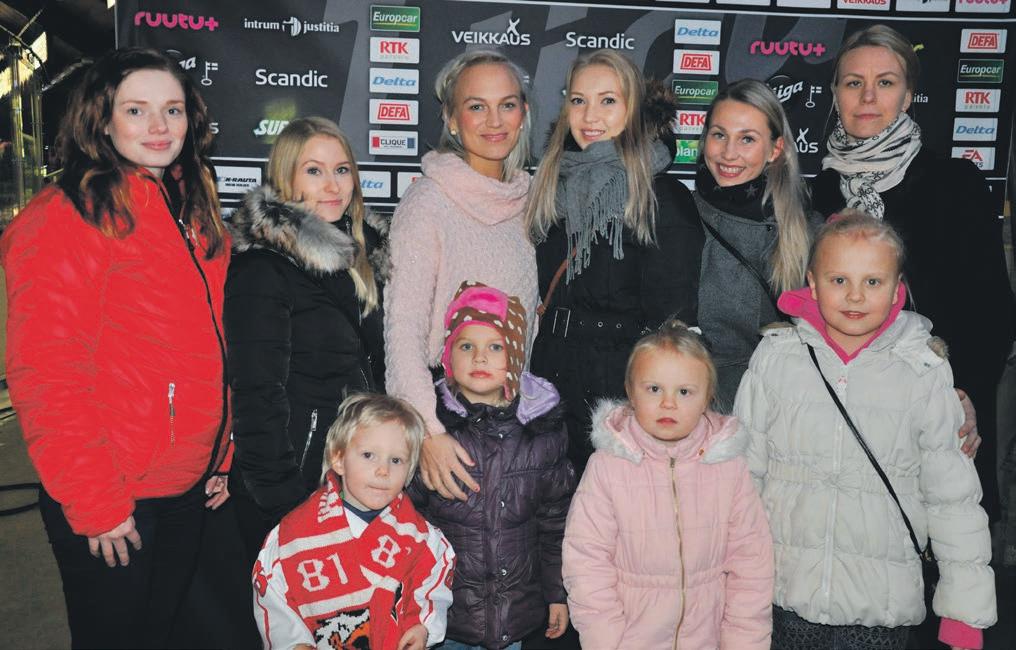 Pelaajien puolisoja ja jälkikasvua yhteiskuvassa: ylärivissä vasemmalta Mimmi Gröndahl, Sini Paavola, Sara Riska, Hanna Vanhoja, Iida Aalto ja Sanna Viitaluoma. Edessä Miko Gröndahl, Molly Riska sekä Venla ja Vilma Viitaluoma.