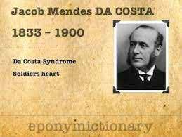 Der er imidlertid en længere artikel i Wikipedia hvor også Da Costa omtales (3) . Den skal kort refereres her: Jacob Mendes da Costa var født i 1833 på St. Thomas, som dengang var en dansk koloni. Han voksede op og blev lægeuddannet i USA. Han gjorde tjeneste ved militærhospitalet i Philadelphia under den amerikanske borgerkrig. Hans beskrivelse af syndromet: “Observations on the diseases of the heart noticed among soldiers, particulaly the organic diseases”, blev offentliggjort i en rapport fra Unites States Sanitary Commission by Hurd and Haughton, New York 1867. Han udgav en mere detaljeret beskrivelse i eget navn i 1871. Han døde I 1900 I USA. Se Wikipedia for yderligere referencer.