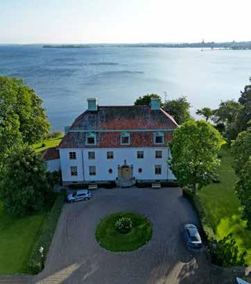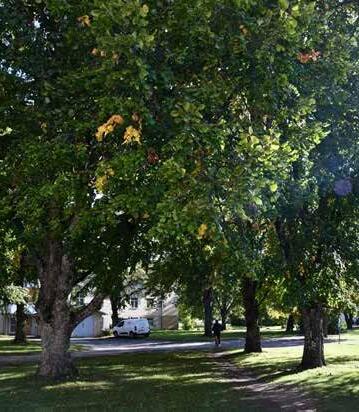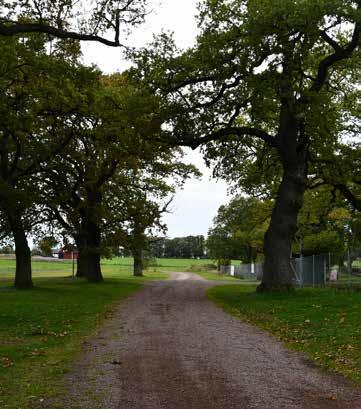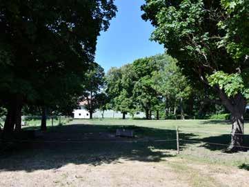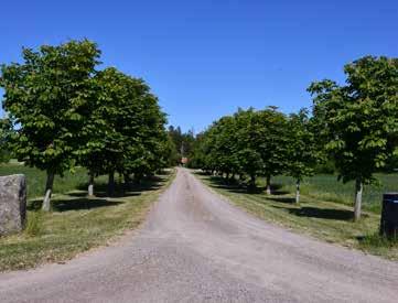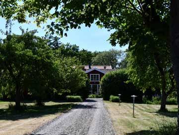 • Trädgård med uppvuxna lövträd och annan växtlighet, liksom en allékantad grusväg som leder fram till gårdsplanen.