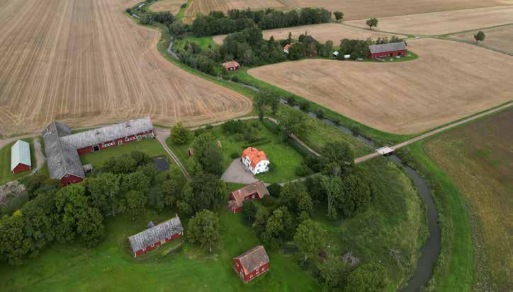 • Agrart präglad bebyggelse i jordbrukslandskapet utanför gårdstomten med rödfärgade eller vitputsade träbyggnader som speglar olika tiders byggnadsskick. Ladugårdar och ekonomibyggnader som vittnar om hur gården har brukats i äldre tid.