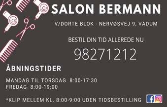 Mandag kl. 8.30-19.00 Onsdag - torsdag - fredag kl. 8.30-18.00 Tirsdag & lørdag lukket - fordi smukt hår gør en forskel ! - du er også velkommen hos... Renommé-Byg ApS|Vester Halne Vej 15|9430 Vadum|Tlf. 22 148 149 www.renommé-byg.dk Vi bygger på gode idéer - din lokale håndværker Renommé BYG TØMRER & SNEDKER GØR EN TRYKSAG TIL EN TRYG SAG! HenningNielsensBogtrykkeriA/S Vodskovvej 36 · 9310 Vodskov Borgergade 17 9620 Aalestrup Telefon: 98 12 96 10