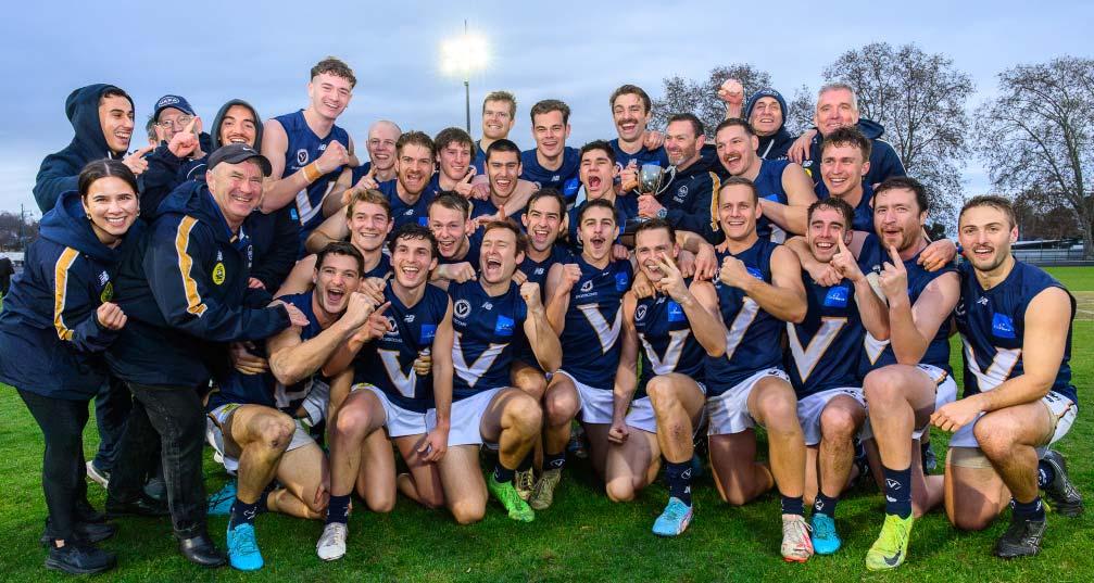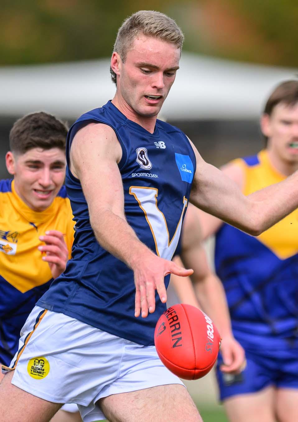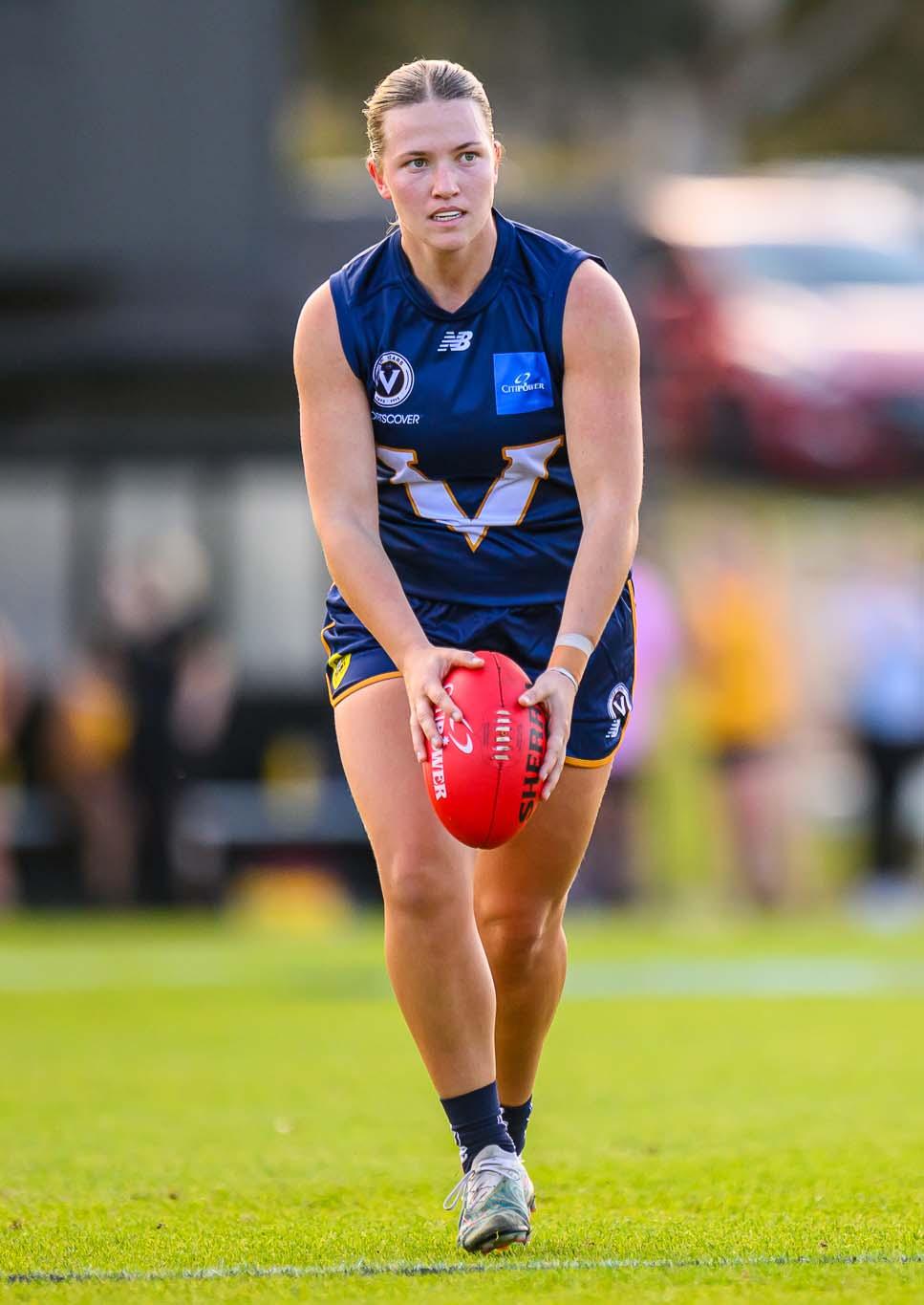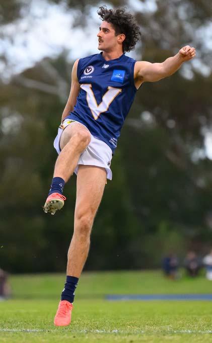 The two teams were going goal-for-goal in an even and entertaining contest. Dane Harvey’s long-range set-shot felt short after being touched by the man on the mark, allowing Charlie MacIsaac to pounce on the front-andcentre crumb to snap a clever goal at the 22-minute mark, as the Big V kicked clear once again.