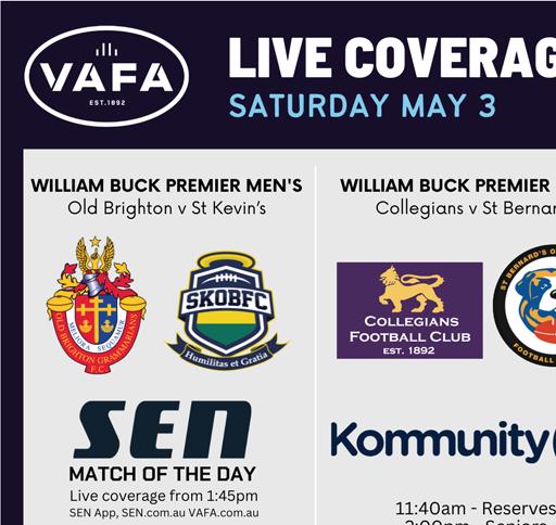 William Buck Premier Women’s Reserve Old Yarra Cobras vFitzroy West Brunswick vSt Kevin’s Old Scotch vOld Geelong Caulfield GrammariansvKew