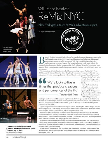 eneath the Moorish, mosaicked ceilings of New York City Center, East Coasters attending Vail Dance Festival: ReMix NYC experienced the exceptional selections of dance and music that have come to define summers in Vail. Year-round Manhattanites enjoy stellar dance performances in a city that brings the best the world has to offer to the stage and boasts its own world-class companies. But the first days of November left even the most seasoned dance enthusiasts swept up by the expansive artistic vision to which Vail dance-goers are accustomed. “Action-packed, stylistically eclectic and with deluxe casting,” praised The New York Times chief dance critic Alastair Macaulay of the thoughtfully constructed programs. In his 2016 yearend dance review, the critic singled out Sara Mearns’ ReMix performance of Alexei Ratmansky’s Fandango, stating “we’re lucky to live in times that produce creations and performances of this ilk.” Like the Festival in Vail, each night was as dynamic as it was exceptional, with a repertory built off 10 years of programming under the artistic direction of Damian Woetzel. “I found it particularly exciting to see the music and dance come together in the historic space at City Center,” reflected Woetzel. “It was thrilling to premiere pieces created in Vail, but unseen in New York, and then on the same program to present Balanchine’s 1928 Apollo on the stage where New York City Ballet performed it in the 1950s.” Apollo was presented in its seldom-seen original version, depicting the birth of the god, and was made complete with Kurt Crowley, Music Director of Broadway’s Hamilton and the Festival’s first Music Director, leading a full orchestra in Stravinsky’s landmark score. Live music added extra energy to an already dazzling lineup of dancers. Yo-Yo Ma, who first accompanied Lil Buck playing Camille Saint-Saëns’ The Swan in a now-viral video, reunited with the jooker for a Jookin’ Jam Session, and was joined by a collection of musicians, including members of the Silk Road Ensemble, the Catalyst Quartet, and Kate Davis. Witnessing partnerships first cultivated in Vail was another highlight for New York audiences. Among many, one remarkable moment was the reuniting of Ron “Prime Tyme” Myles and Fang-Yi Sheu, whose exquisite Anywhere on this Road exemplifies the adventurous, collaborative spirit that is central to the Festival’s identity. When asked if audiences can look forward to new iterations of Vail Dance Festival: ReMix NYC, Woetzel hinted that the happening was “designed and even titled with the anticipation of taking this to other cities.”