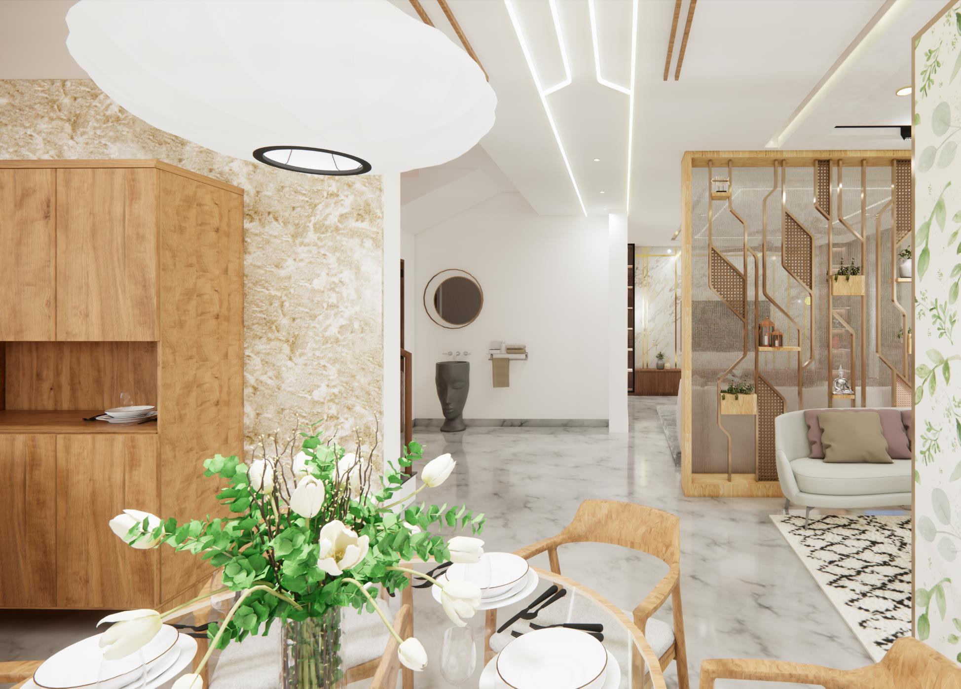 This Villa took shape into a contemporary vogue interior theme, the client was very sure of her idea and imagination , which was put into reality by VAYA. The Client lived several years in USA & wanted to feel a similar vibe of wooden interiors like in USA. Thus, the kitchen took its form and style in wooden and glass giving it a modern yet contemporary look.