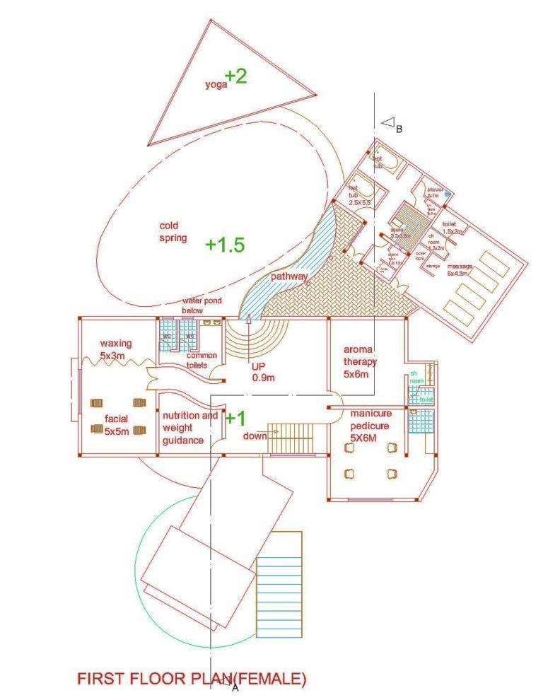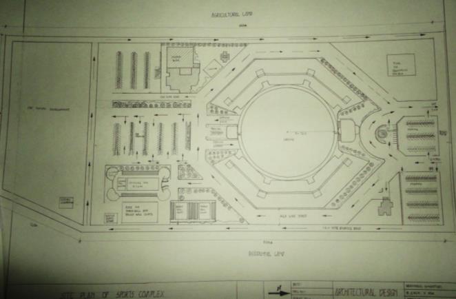 SITE Is a contoured site sloping 3m towards the road. The design problem was to retain the contours and design a unisex spa. THE stadium was to be designed for 25000 people.