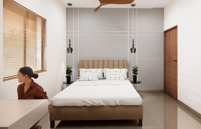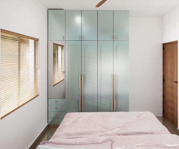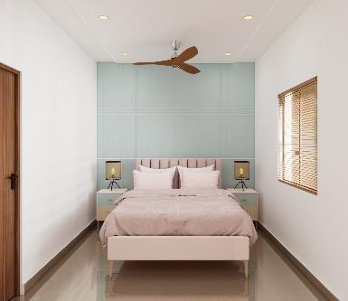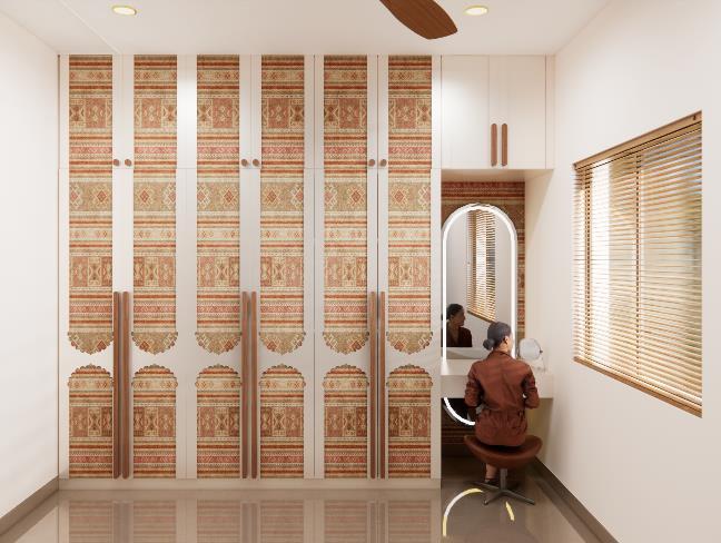 Very economical project . Wardrobes designed with fabric laminates, matt finish laminates and leather finish laminates to work out the expenses yet feel expensive. Wallpapers used to drive out unreasonable wall paneling.
