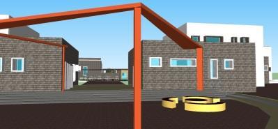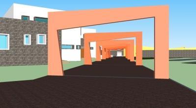 Yellow and orange extruded walls indicate shading device catering shade to pedestrian walkways