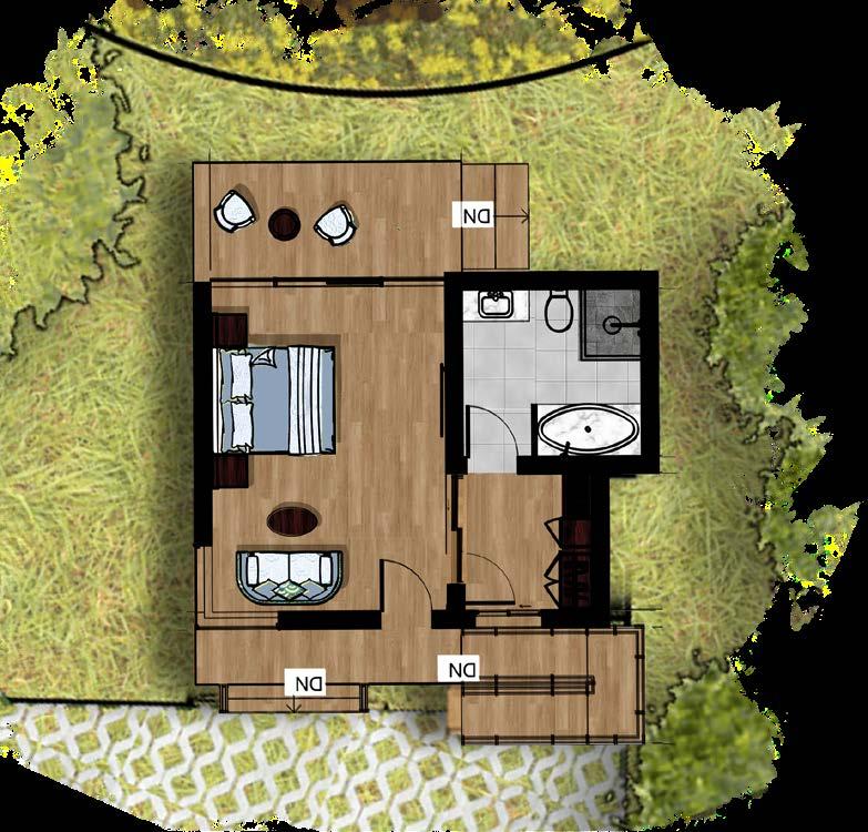 The villas mainly cater to families, hence consisting of 2 bedrooms, each with a spacious deck. It also features an outdoor shower and a private garden. These structures are envisioned to be simplistic in spirit to not disturb the natural harmony. The exposed earth blends in gently with the surroundings, enhancing the dramatic setting of the cottages in the hills.