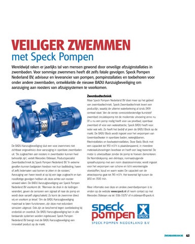 Maar Speck Pompen Nederland BV doet meer op het gebied van zwembadtechniek. Speck Zwembadtechniek levert een productlijn, waarbij de ultieme waterbeleving al sinds 1909 centraal staat. Van de eerste corrosoriebestendige kunststof zwembad circulatiepomp tot de modernste uitvoering anno nu. Of u nu een pomp nodig heeft voor uw privébad, openbaar zwembad of voor een waterattractie, Speck BADU heeft voor ieder wat wils. Zo heeft het bedrijf al jaren de BADU Block op de markt. De BADU Block wordt ingezet voor het verpompen van (zwembad)water in openbare baden, waterglijbanen, filterinstallaties en koelwaterinstallaties. Deze Badu Block met een capaciteit tot 950 m3/h is plaatsbesparend, in meerdere materiaaluitvoeringen leverbaar en heeft een laag toerental. De motor is uitwisselbaar zonder de pomp te hoeven demonteren. De Normblokpomp, een ééntraps, normaalzuigende spiraalhuispomp met een norm draaistroommotor, wordt ingezet voor het verpompen van schone en licht verontreinigde vloeistoffen, koud en warm water. De capaciteit van de attractiepomp gaat tot 740 m3/h. Het toerental ligt tussen de 1450 en 3500 min. Meer informatie over deze en andere zwembadpompen is te vinden op de website www.speck.nl of neem contact op met Mercedes Olderaan via tel. 0316-331757 of m.olderaan@speck.nl.